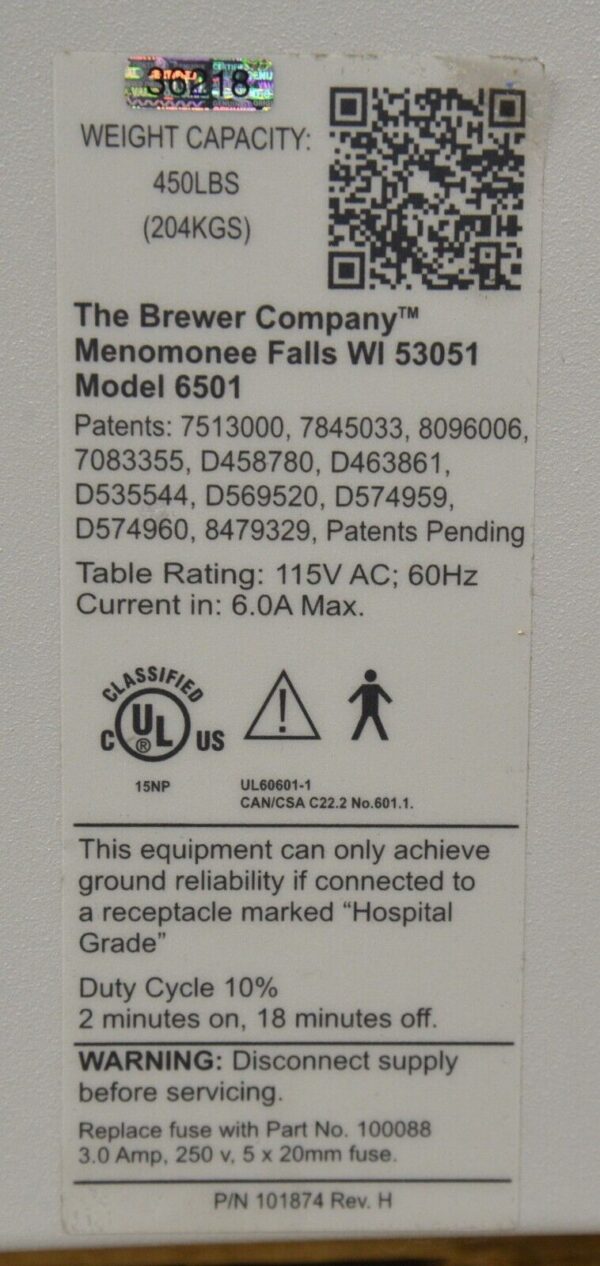 Brewer 6501 Power Back Access Hi-Lo Exam Table W/ Foot Switch