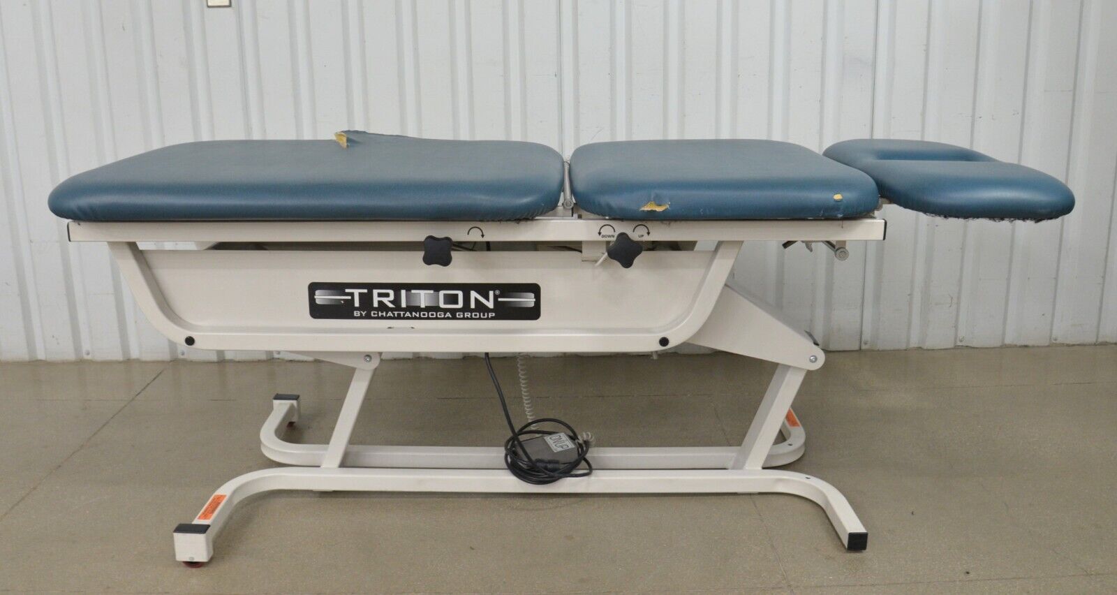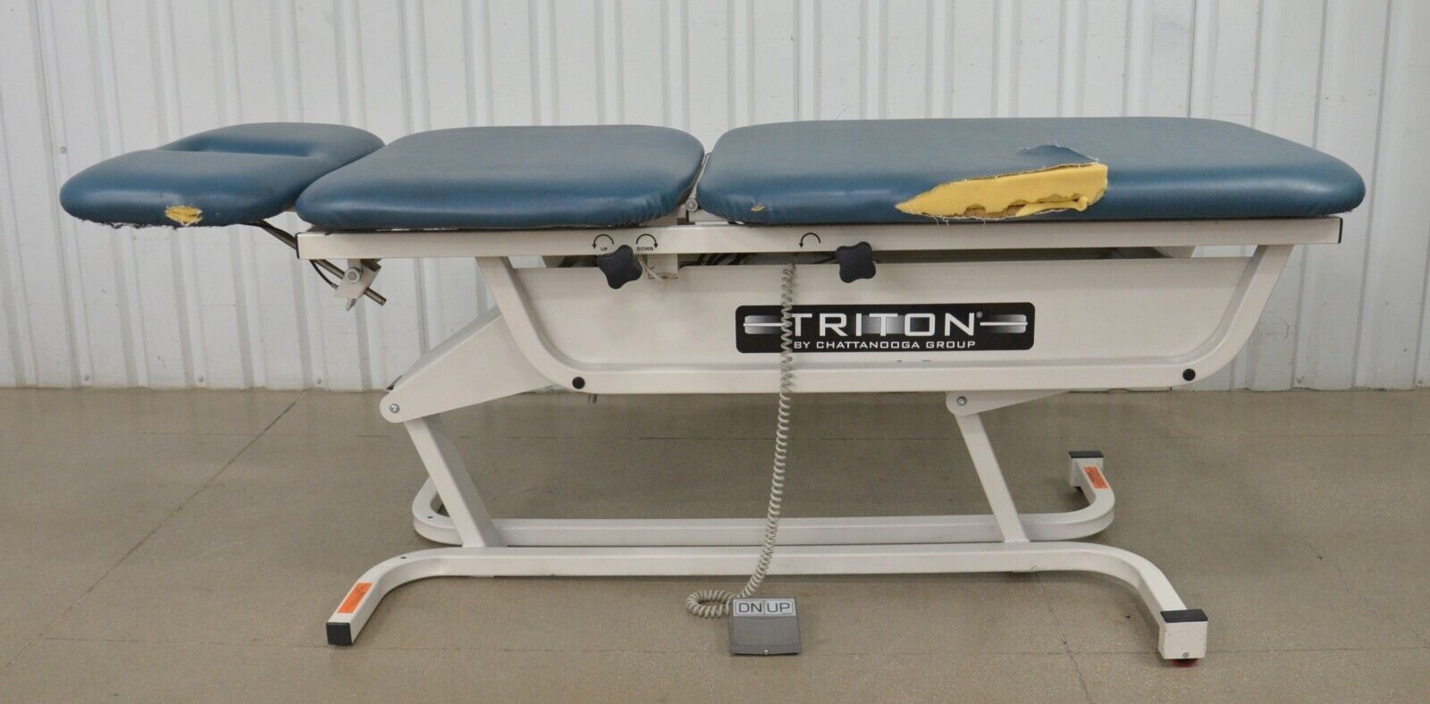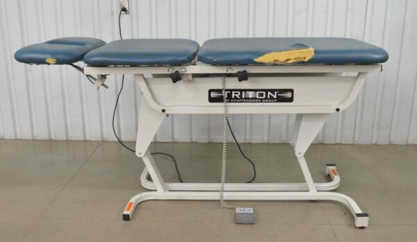 This Chattanooga Group TRT-300 Triton Adjustable Treatment Table W/ Foot Pedal is in fair condition. The table adjustments move smoothly. This unit is missing the retractable caster lever and caster which is only used when moving the table from one location to another. The upholstery has tears in it. For these reasons the table is being sold for parts. There are minor scuff marks previous use (see photos). Includes everything in the pictures and nothing else.