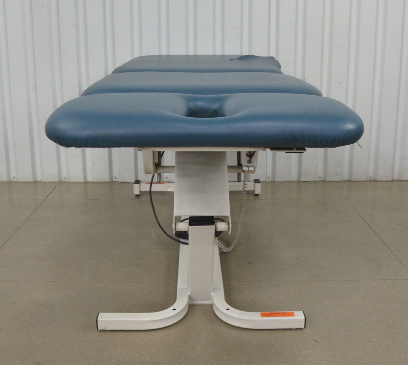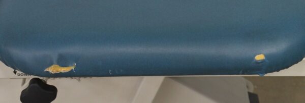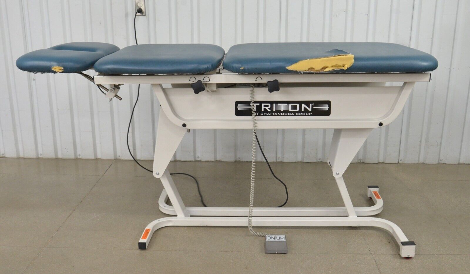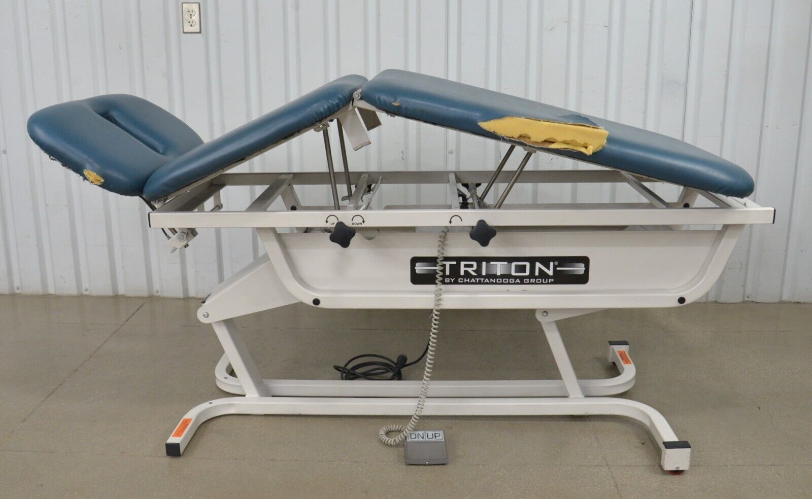 This Chattanooga Group TRT-300 Triton Adjustable Treatment Table W/ Foot Pedal is in fair condition. The table adjustments move smoothly. This unit is missing the retractable caster lever and caster which is only used when moving the table from one location to another. The upholstery has tears in it. For these reasons the table is being sold for parts. There are minor scuff marks previous use (see photos). Includes everything in the pictures and nothing else.