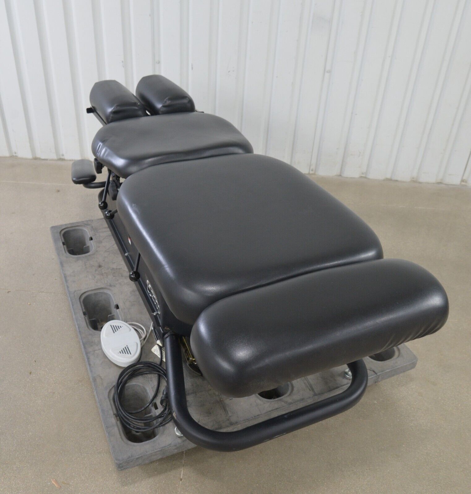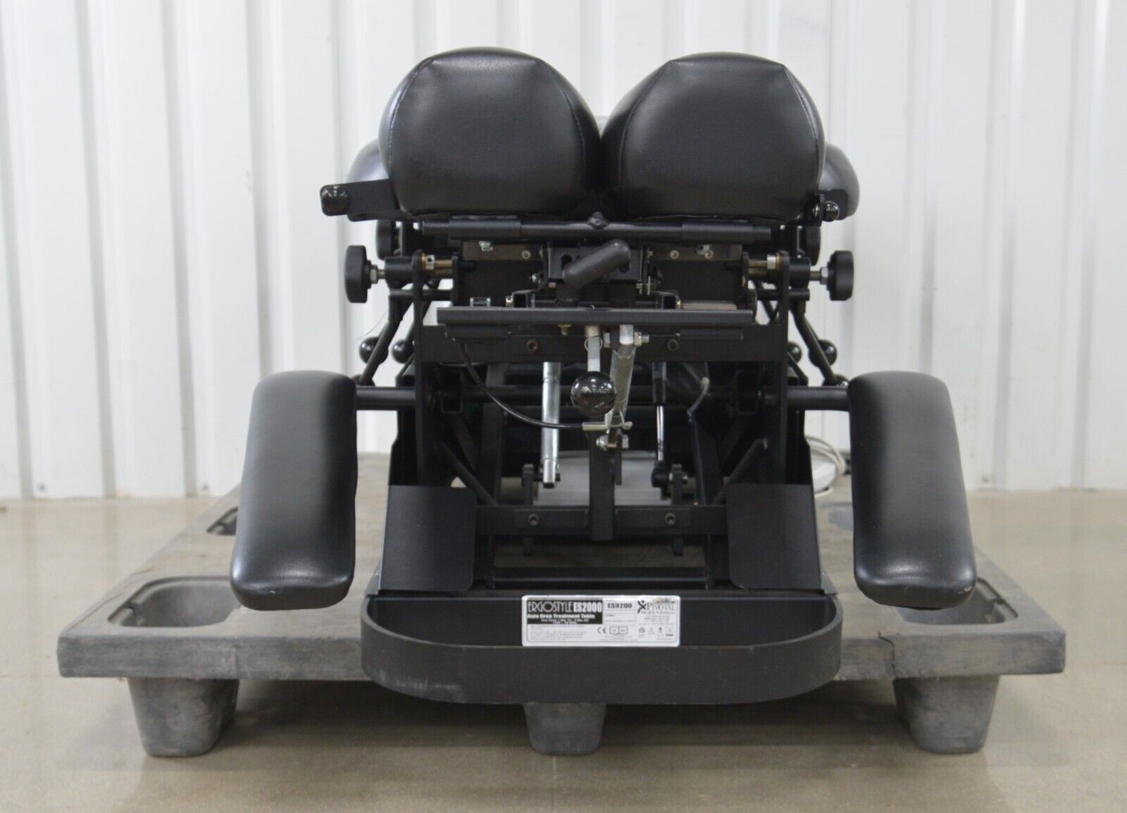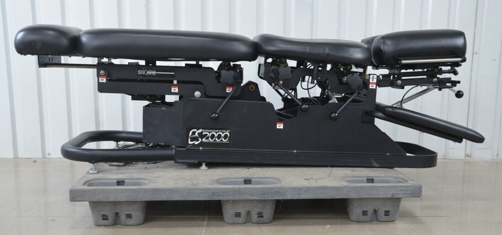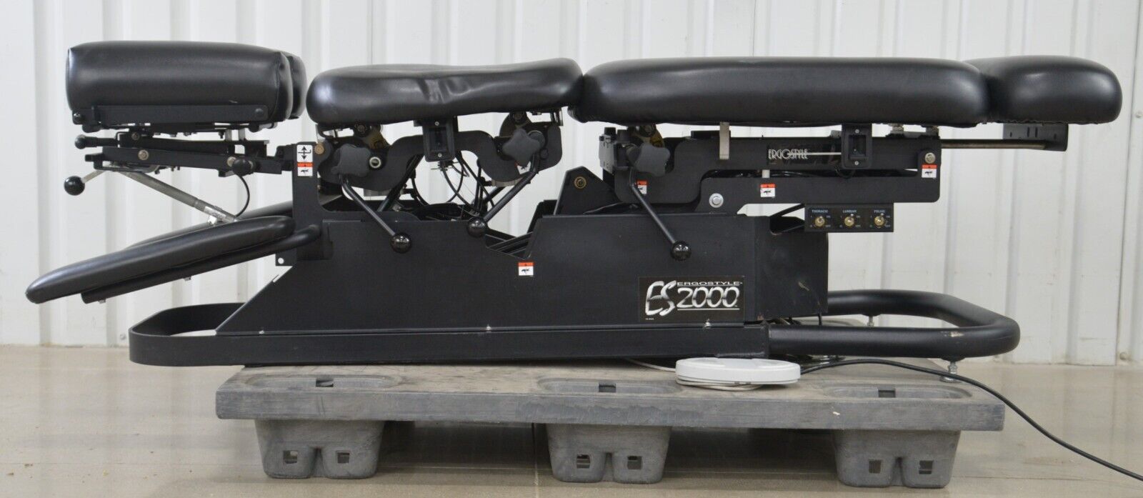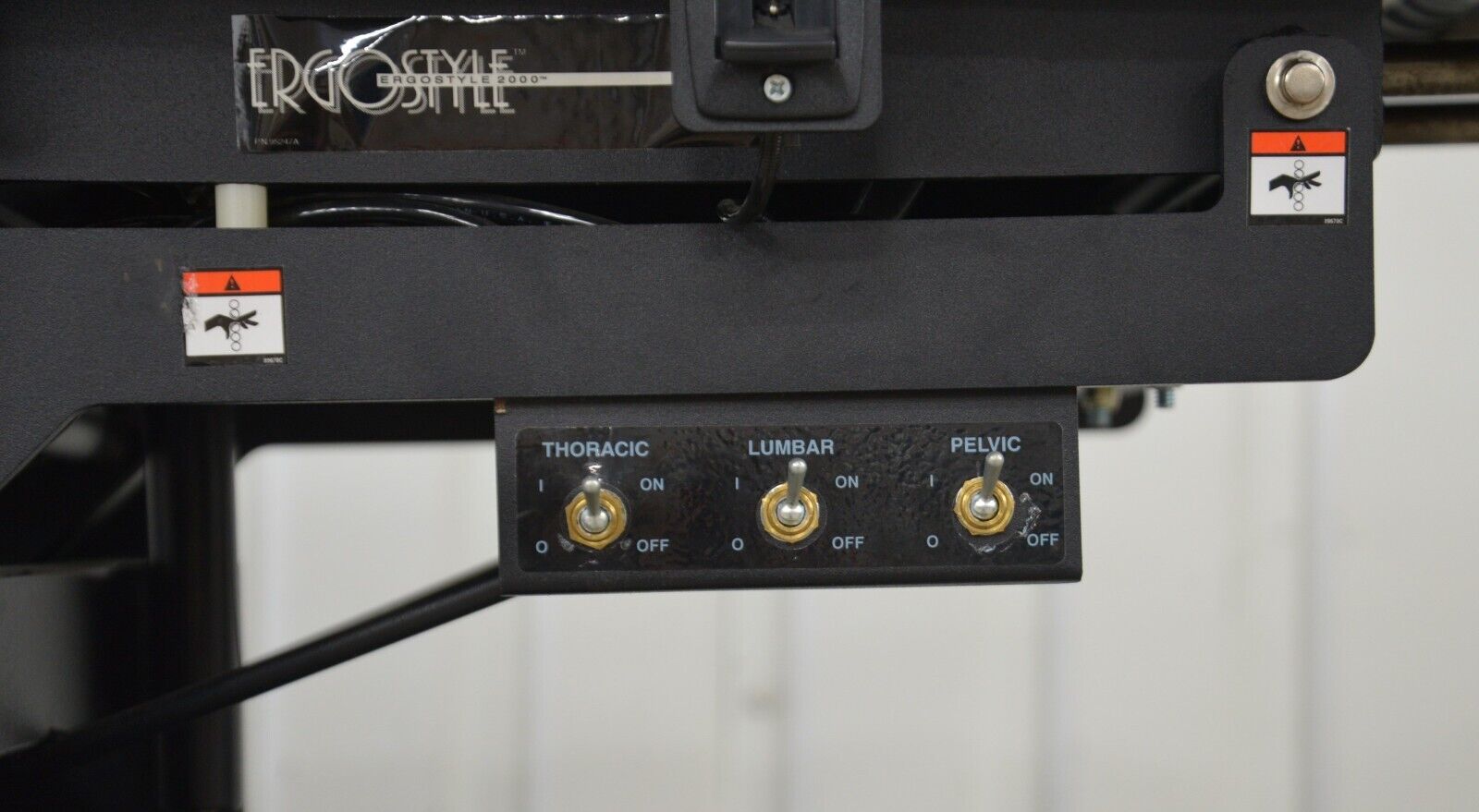 This Ergostyle Treatment Table ES9200 is in very good condition. Minor tear (see photo). Chair maneuvers smoothly and quietly through motion. All manual seat levers adjust properly. There is some wear and paint chipping on the black metal skirting but it does not affect performance. Includes a foot pedal. This unit comes with a 30 day money back guarantee. Includes everything in the pictures and nothing else.
