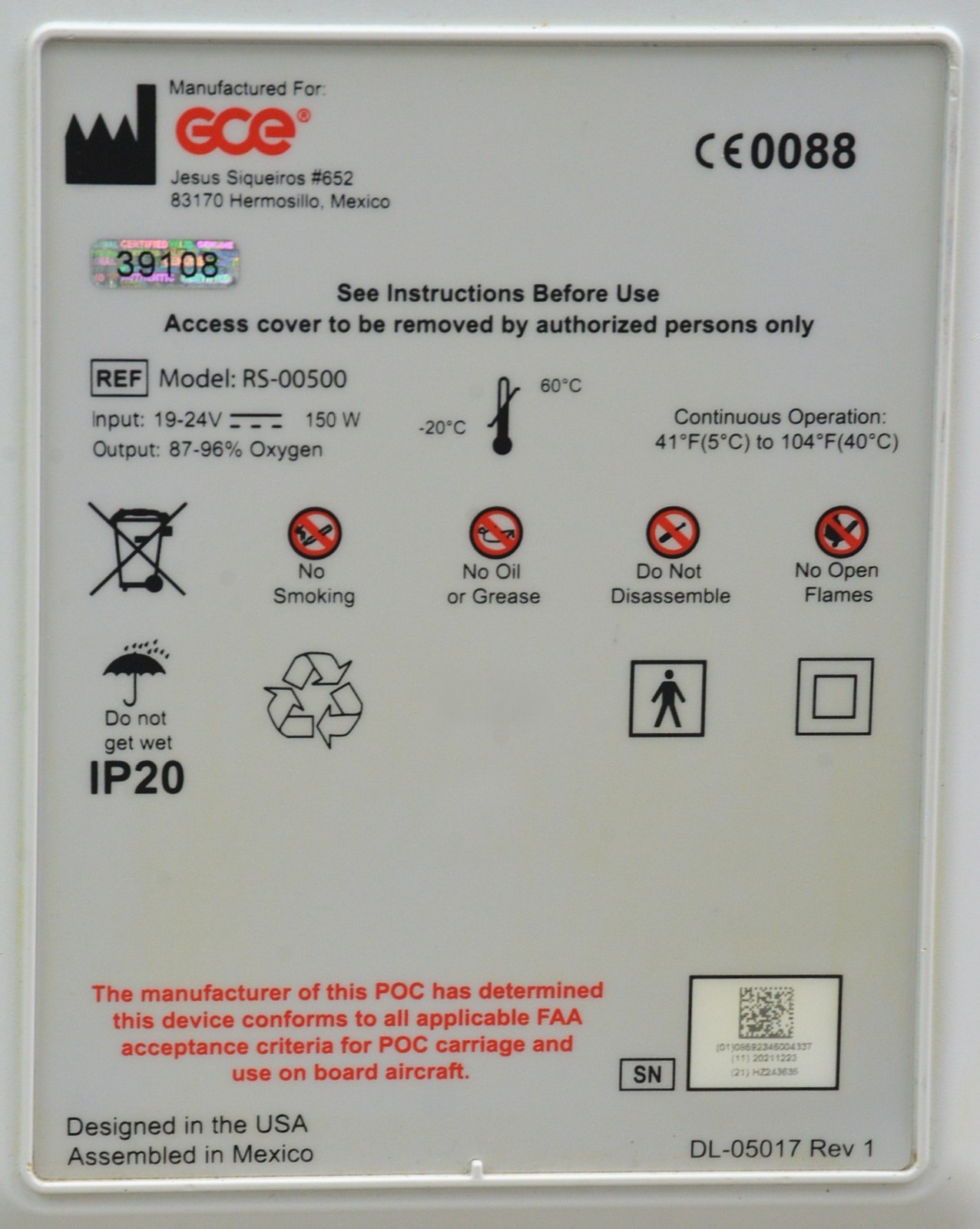 This GCE Zen-O RS-00500 Portable Oxygen Concentrator With Charger And Accessories is in great working condition. The unit powers on and the display screen responds to selections. The connections are clean and in good condition. The air flow is clean and consistent. There are some minor scuff marks and discoloration from previous use (see photos). This unit comes with a 30 day money back guarantee. Includes everything in the pictures and nothing else.