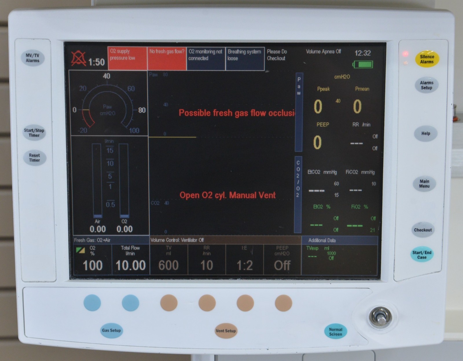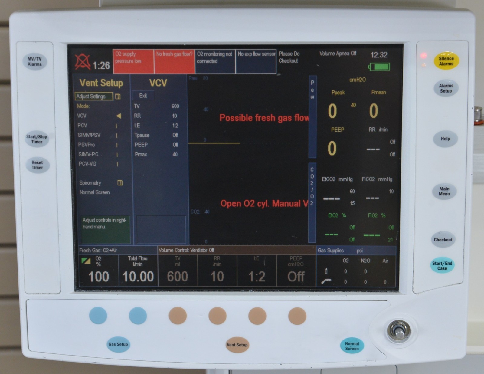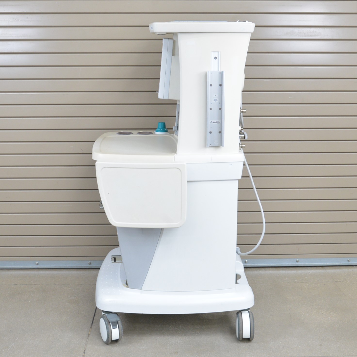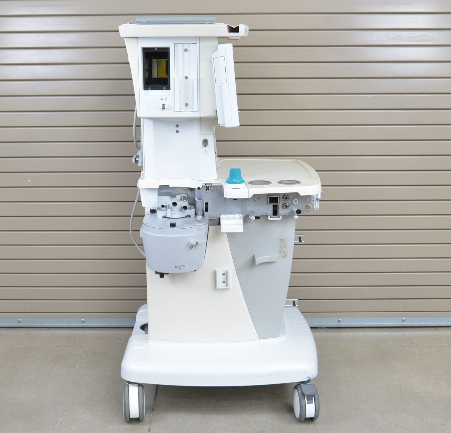 This GE Datex Ohmeda S/5 Avance Anesthesia Machine 1009-9002-000 is in good working condition. The system powers on properly. The display screen has a clear image and responds properly to selection. All connection points are clean and in good condition. The battery holds a charge. This unit is missing the control knob, drawers, the flow sensor and cover, absorber canister and release, bag/vent switch, the bellows assembly and the breathing system. There are scuff marks, cracks and discoloration from previous use (see photos). This unit comes with a 30 day satisfaction guarantee. Includes everything in the pictures and nothing else.