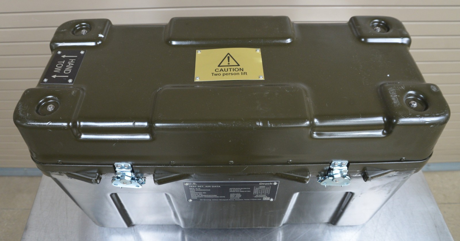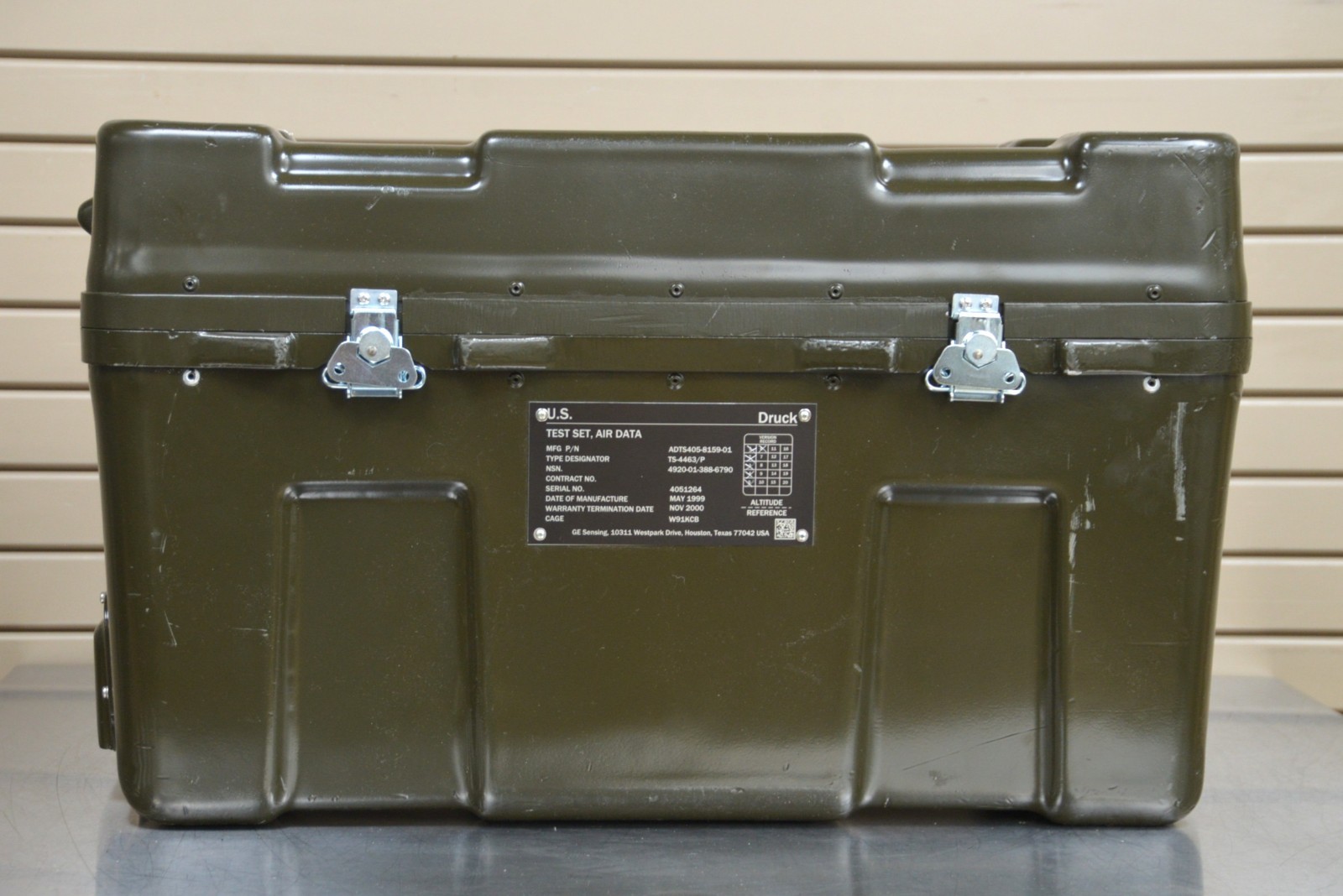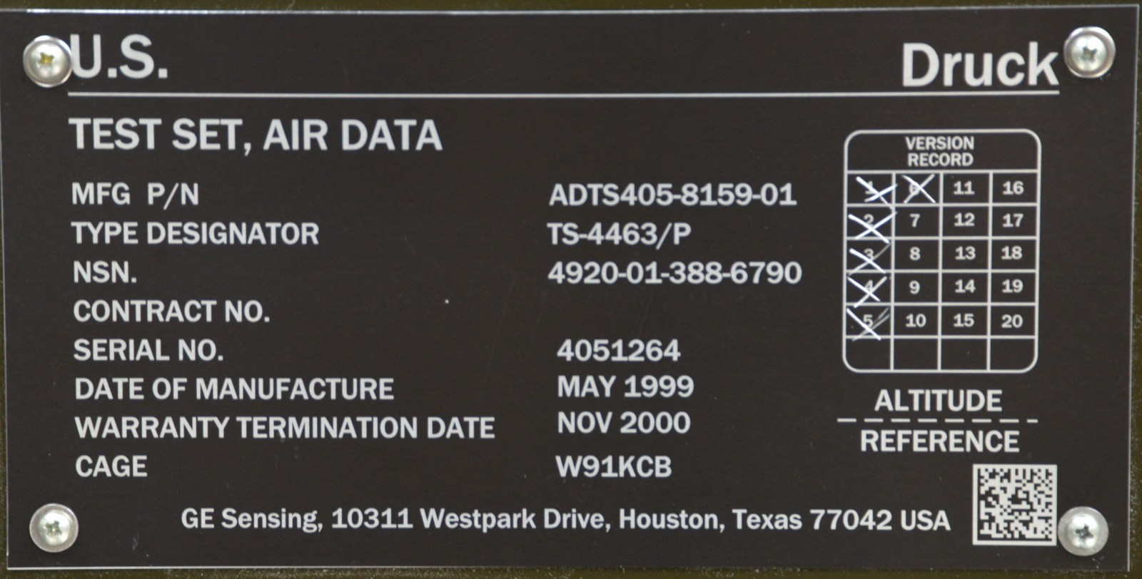 This GE Druck ADTS405 Aircraft Air Data Test System is in good cosmetic condition. This unit has a missing fan outlet and a missing solenoid status indicator, for this reason it will be sold for parts. The ports are clean and in good condition. This unit is missing the wheels. This unit has some and scuff marks from previous use (see photos). Includes everything in the pictures and nothing else.