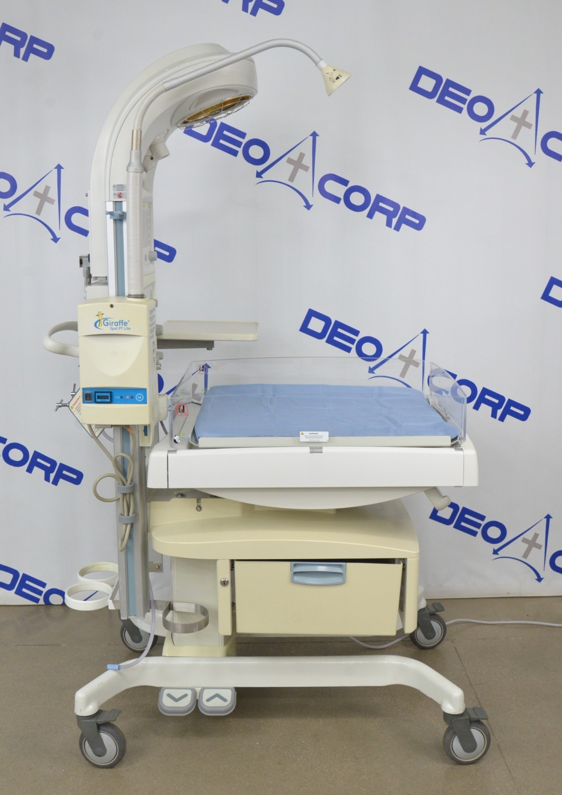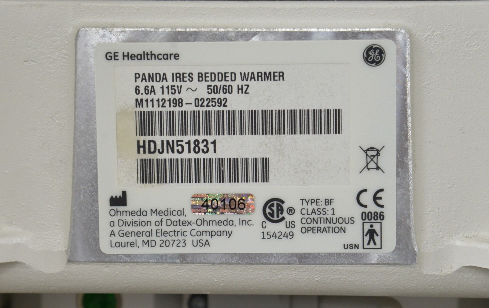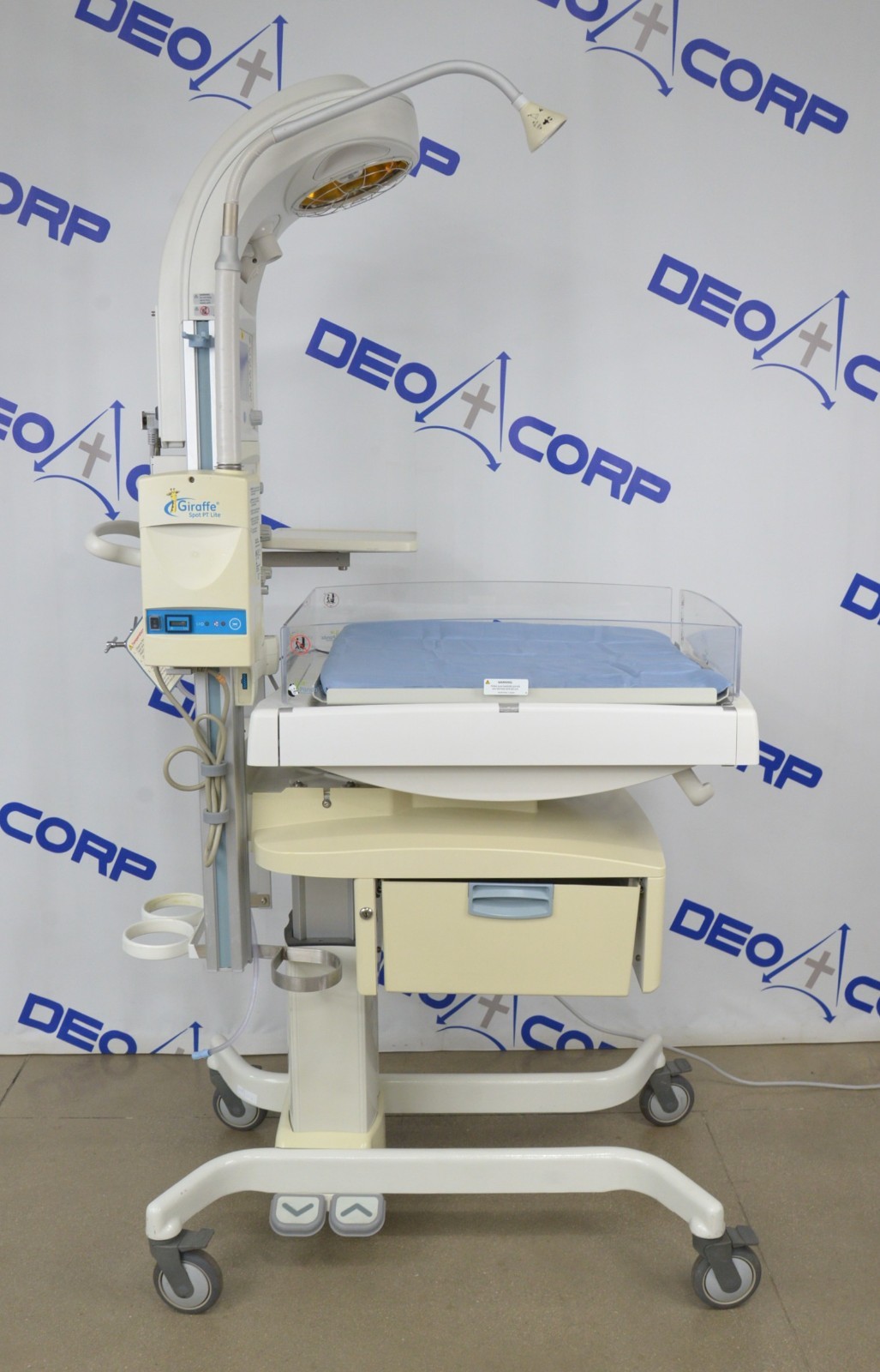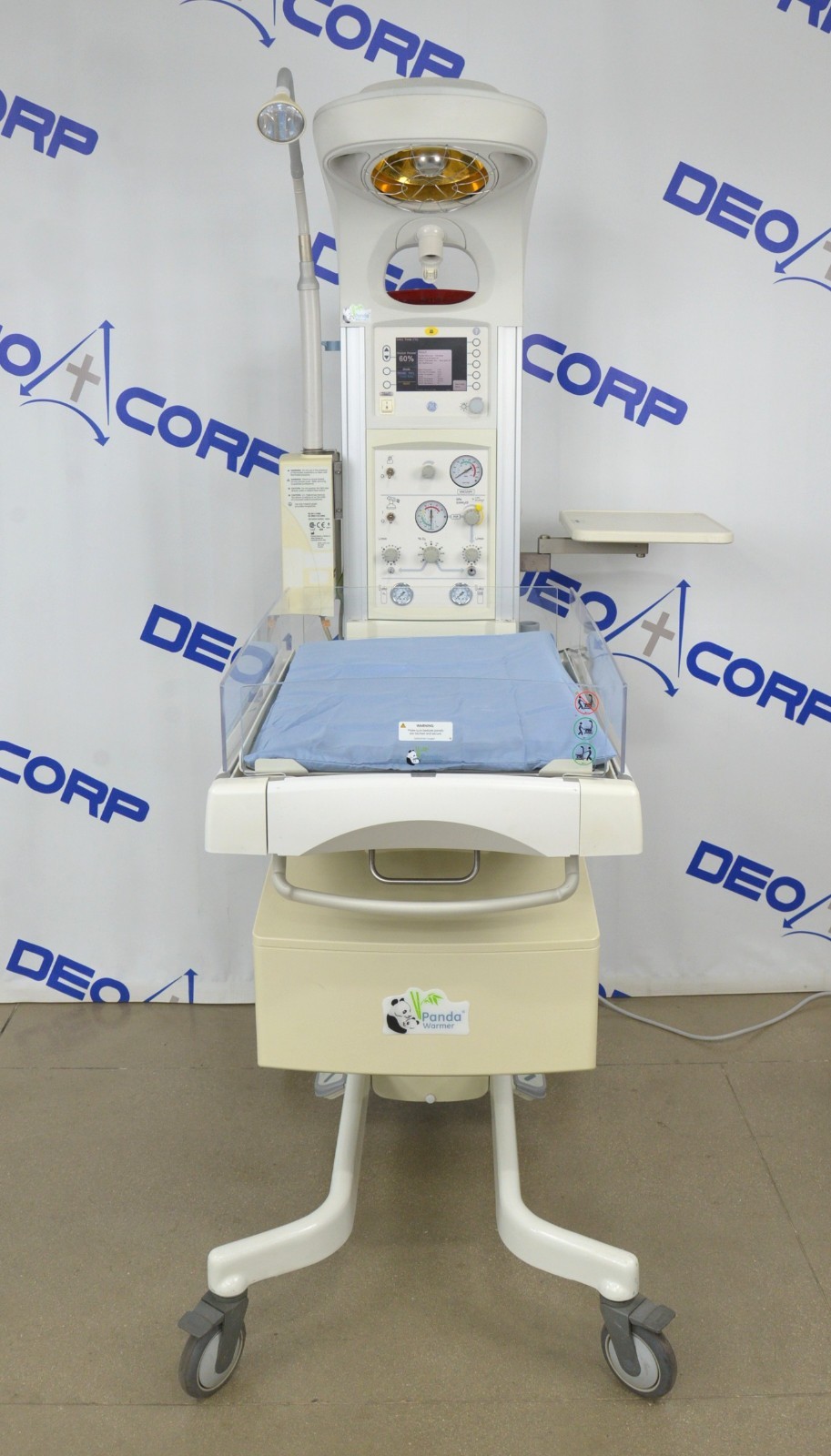 This GE Healthcare Panda IRES Bedded Warmer W/ Masimo SpO2 1502 T-Piece Blender & Giraffe Spot PT Light is in great working condition. The unit powers on and warms up properly. The unit responds to selection and the scale measures accurately. All the adjustments moves smoothly. The spot light has 581 hours. There are scuff marks and discoloration from previous use (see photos). There is a small crack on top of the draw case. This unit comes with a 30 day satisfaction guarantee. Includes everything in the pictures and nothing else.