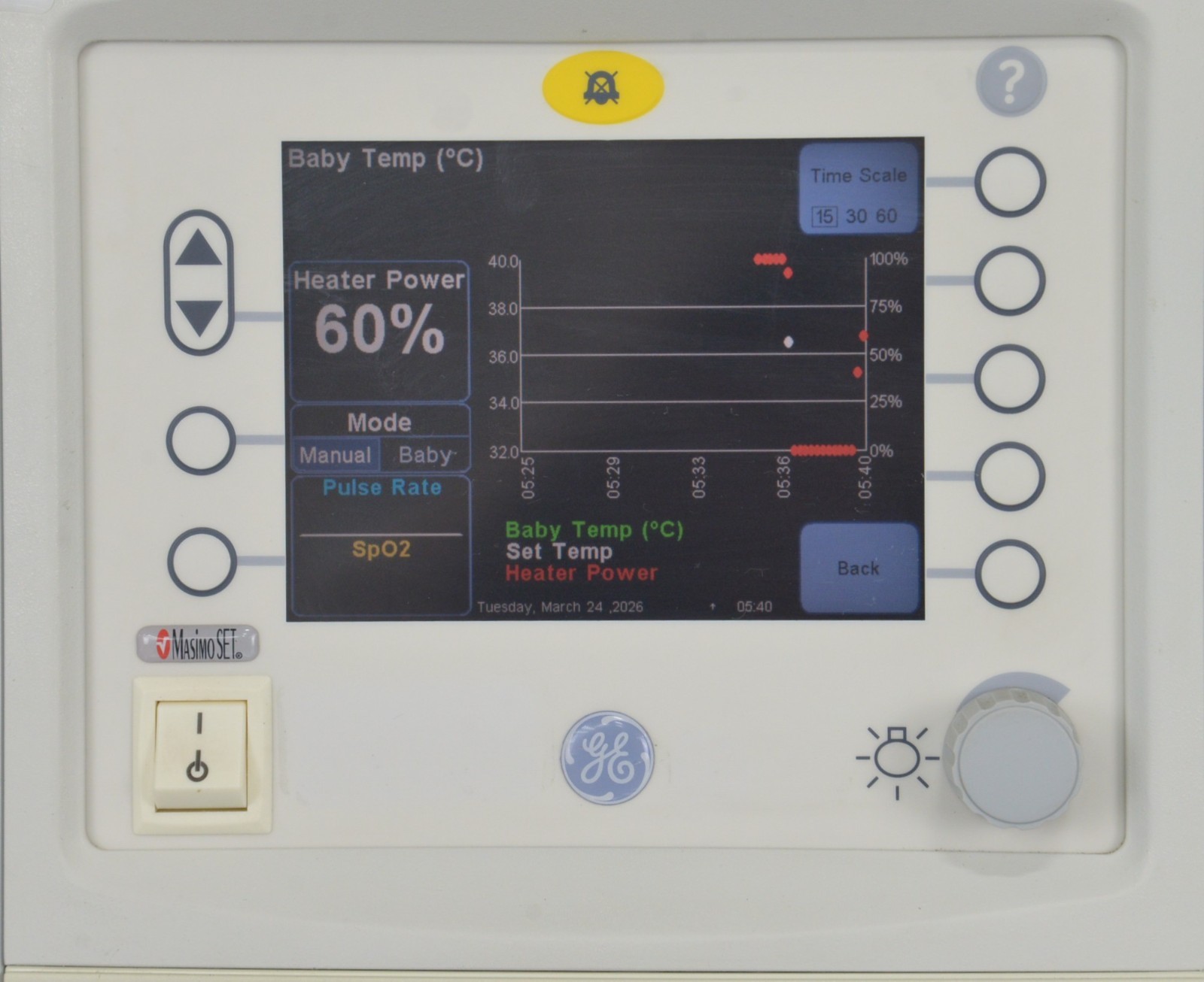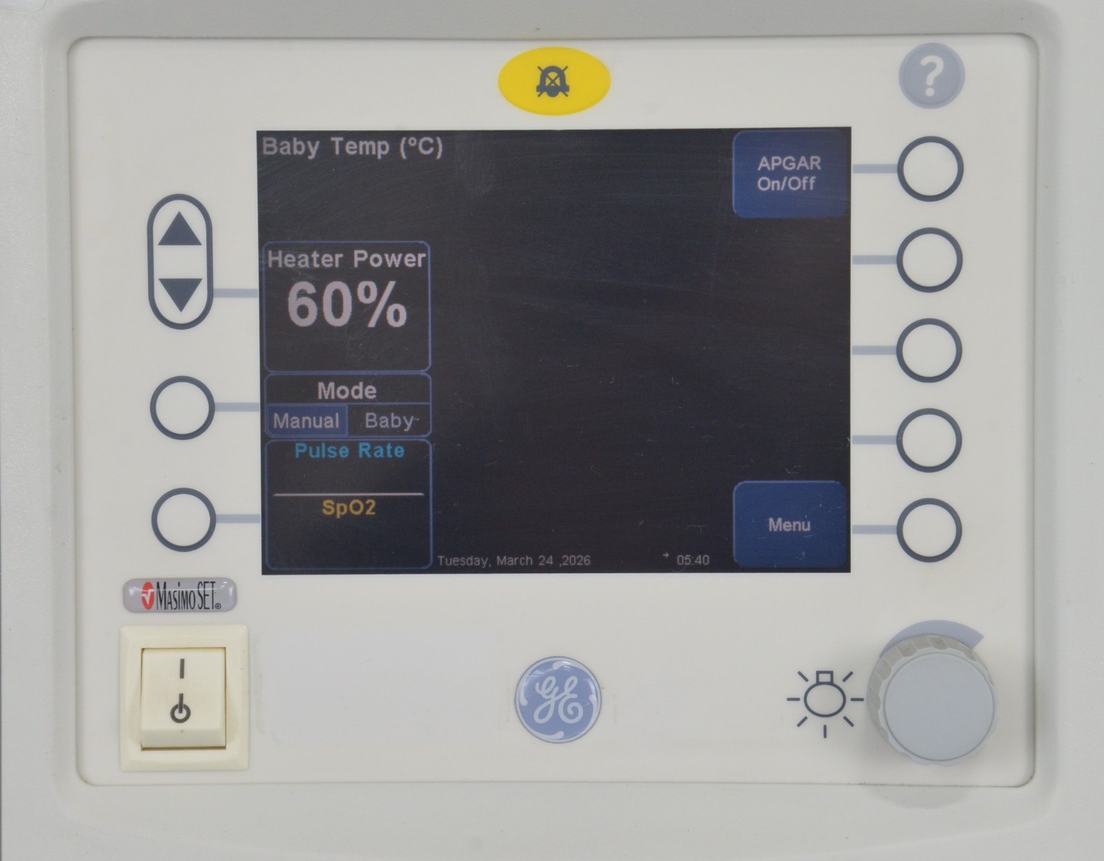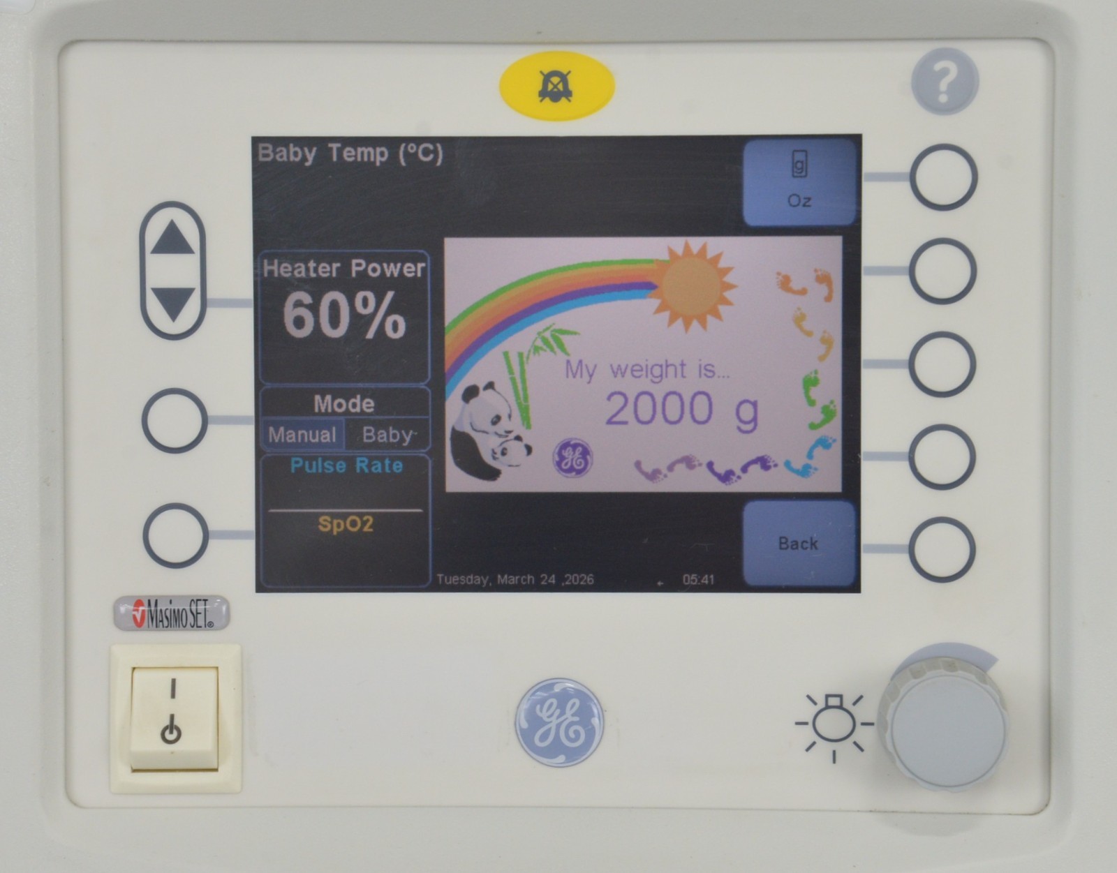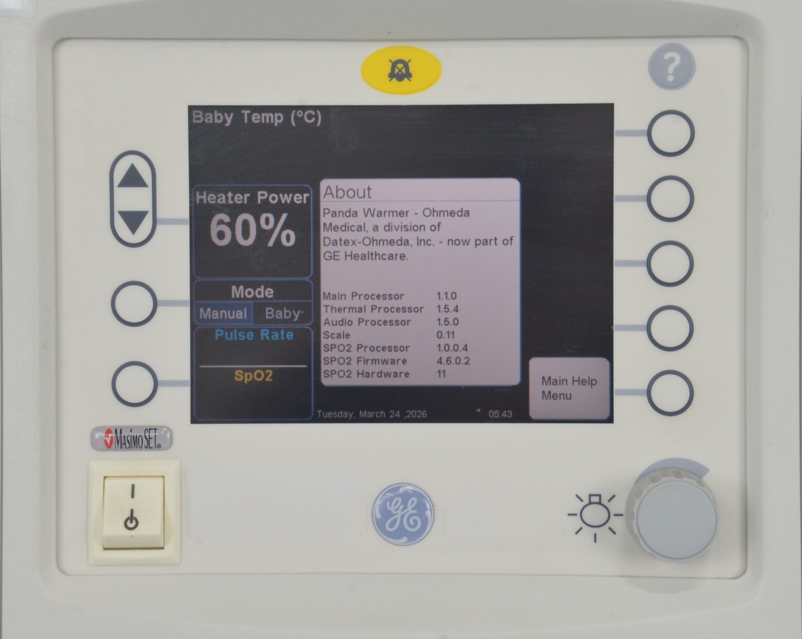 This GE Healthcare Panda IRES Bedded Warmer W/ Masimo SpO2 1502 T-Piece Blender & Giraffe Spot PT Light is in great working condition. The unit powers on and warms up properly. The unit responds to selection and the scale measures accurately. All the adjustments moves smoothly. The spot light has 581 hours. There are scuff marks and discoloration from previous use (see photos). There is a small crack on top of the draw case. This unit comes with a 30 day satisfaction guarantee. Includes everything in the pictures and nothing else.