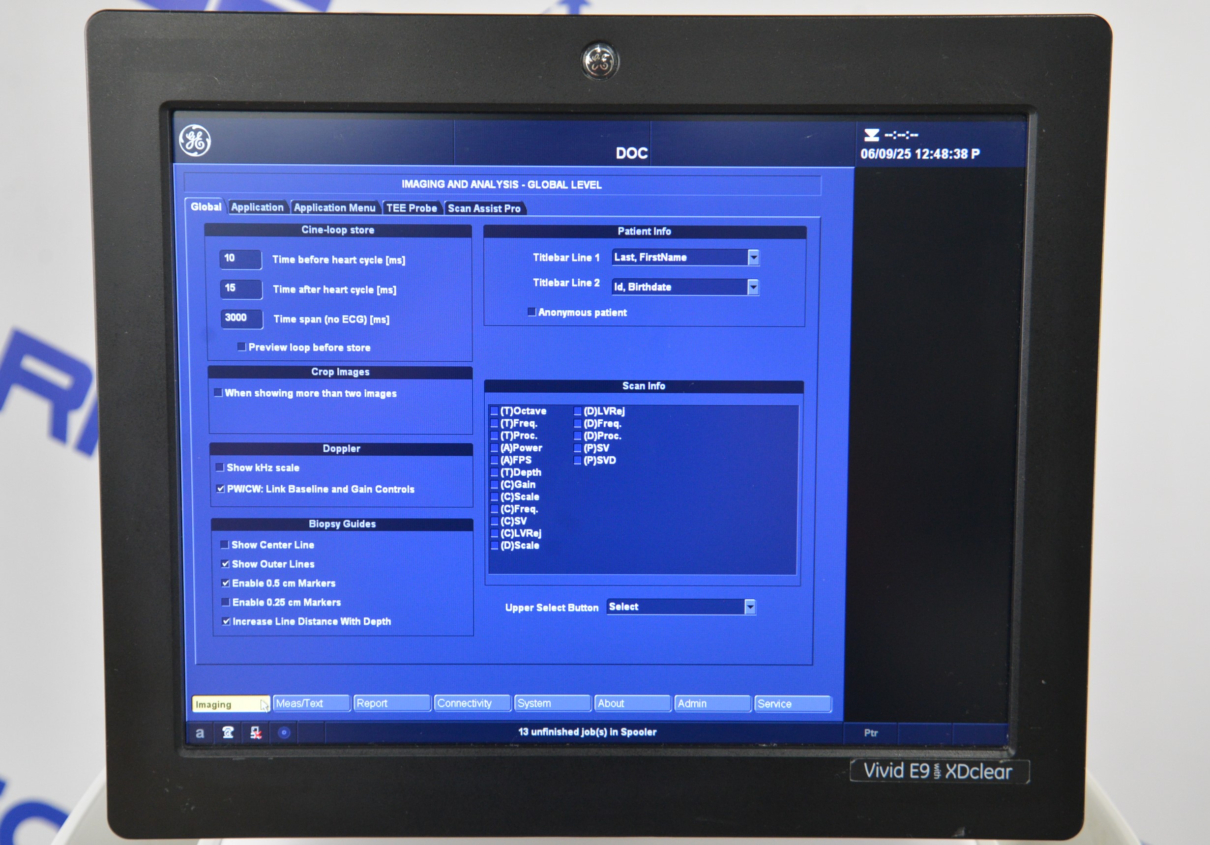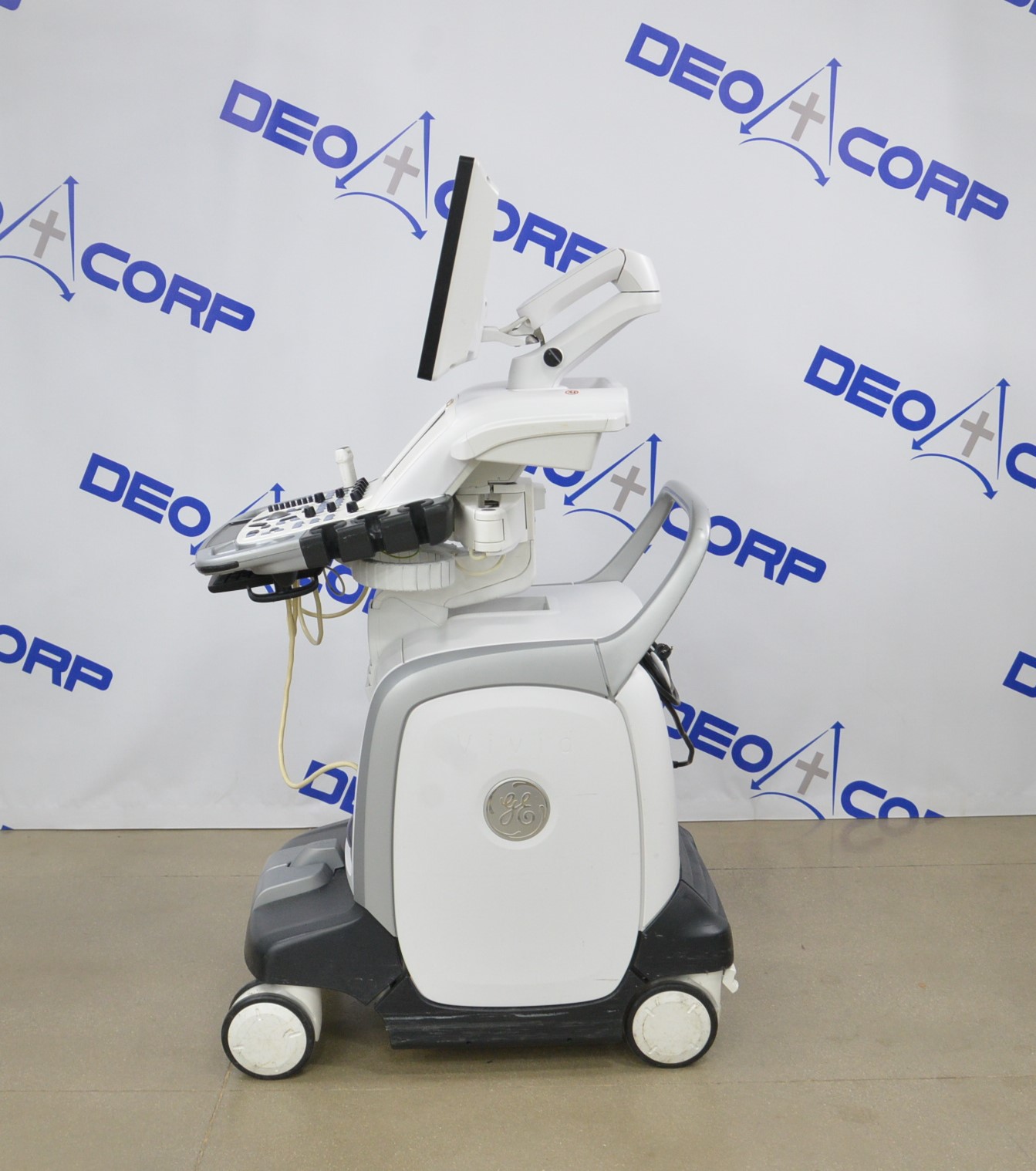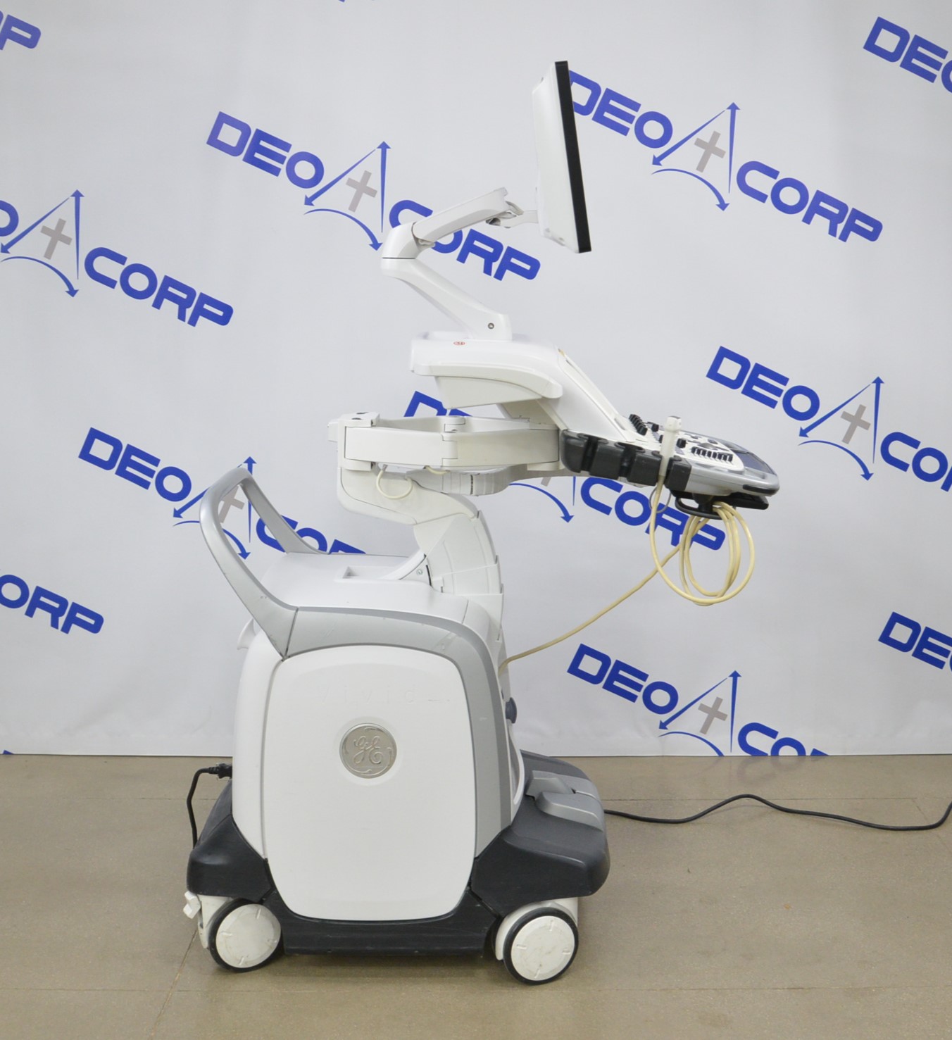 This GE Vivid E9 XDclear Cardiac Ultrasound System W/ M5S-D Probe & P2D Doppler Probe is in great working condition. The system powers on properly. Both display screens produce a clear image and respond to all selections. The connections are clean and in good condition. There are minor scuff marks from previous use (see photos). This unit comes with a 30 day satisfaction guarantee. Includes everything in the pictures and nothing else.