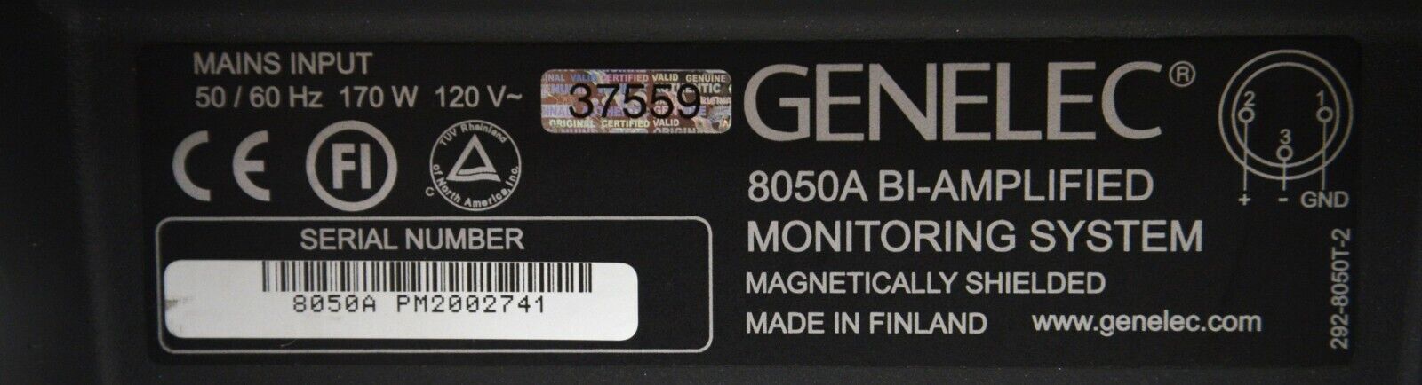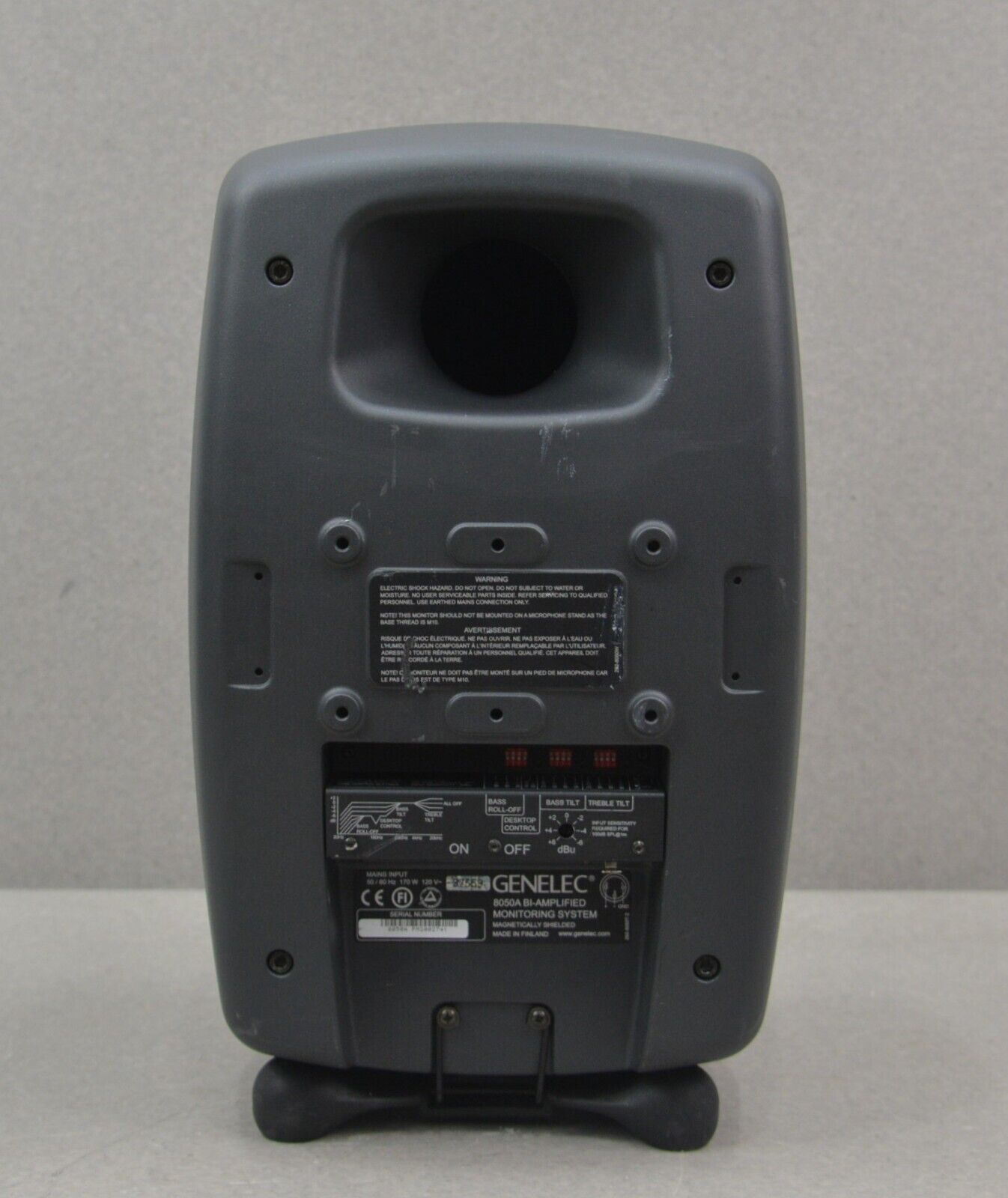This Genelec 8050A Bi-Amplified Active Monitoring System PM20021741 powers on and is in good working condition. All connection ports are clean and in good condition. There are some scuff marks from previous use (see photos). This unit comes with a 30 day money back guarantee. Includes everything in the pictures and nothing else.