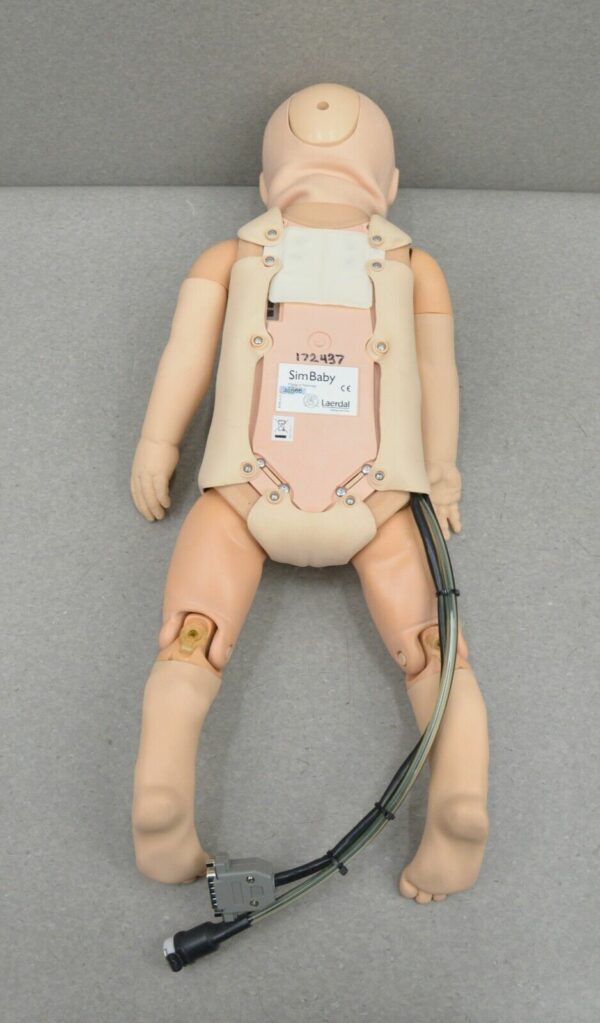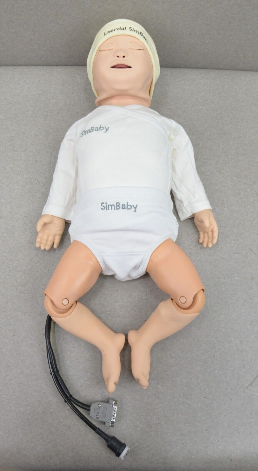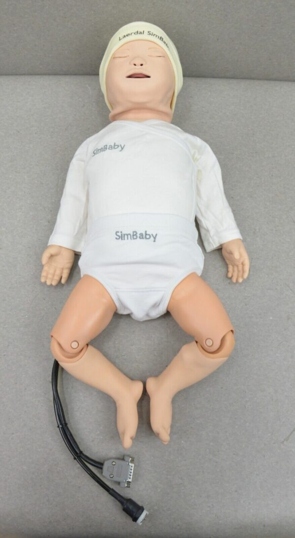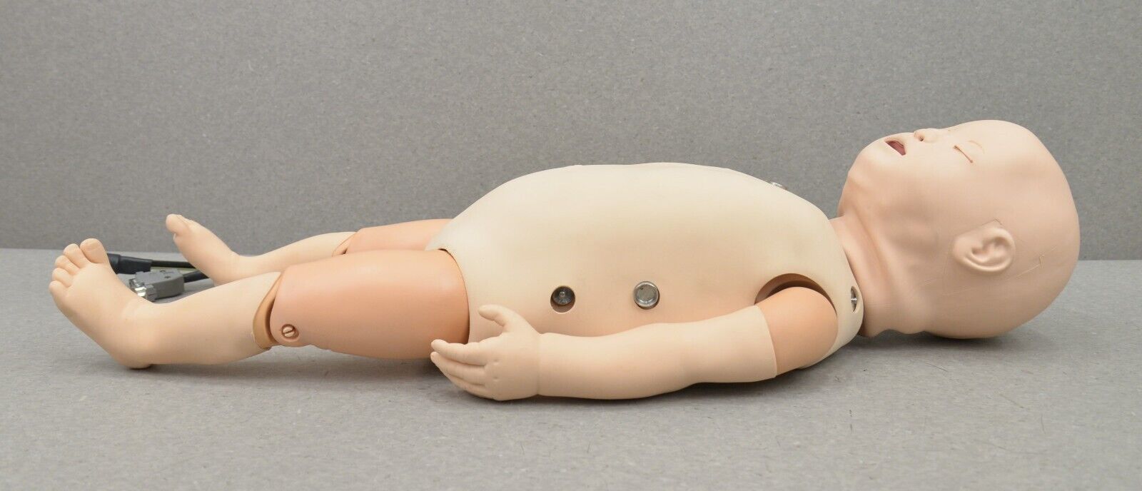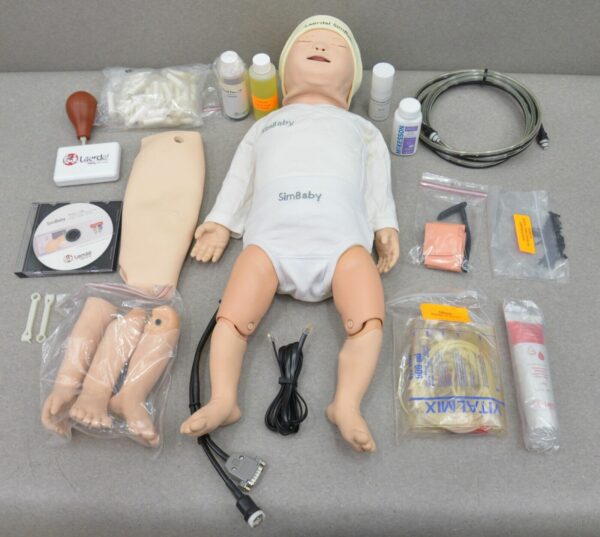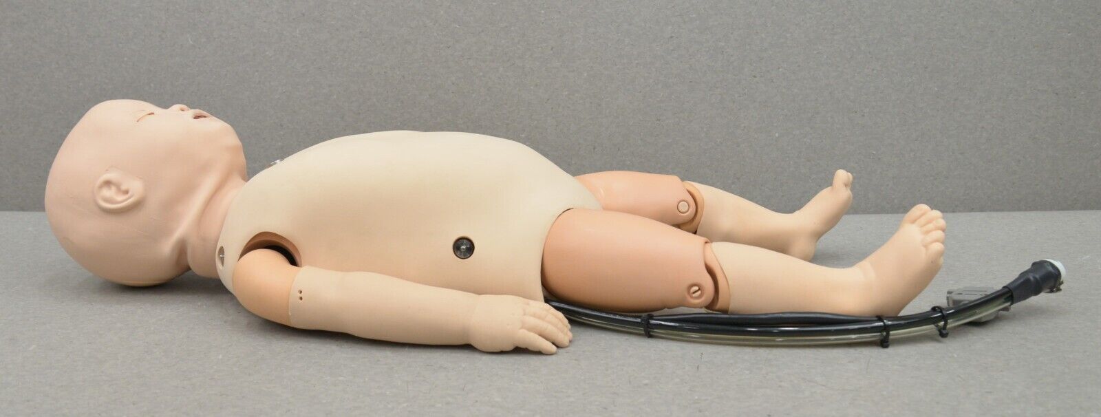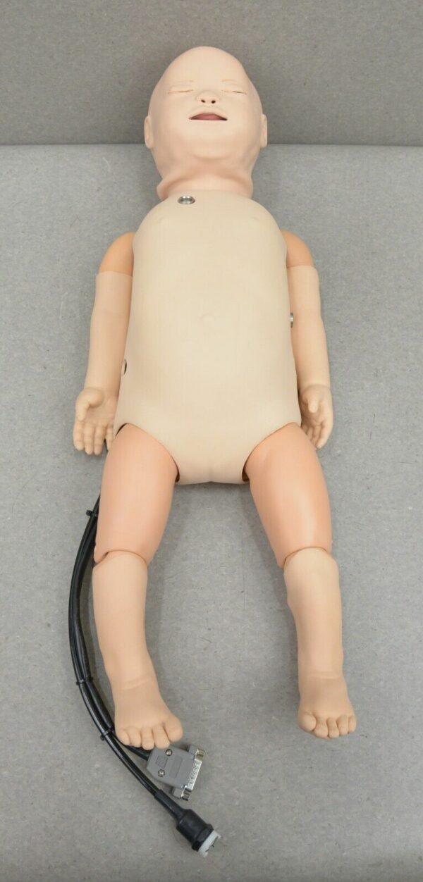 This Laerdal SimBaby Training Manikin W/ Accessories comes from a working environment and is in good condition. All connection points are clean and in good condition. The cosmetic condition is good with a few minor scuffs and discoloration (see photos). See list below for included items. This unit comes with a 30 day satisfaction guarantee. Includes everything in the pictures and nothing else.
