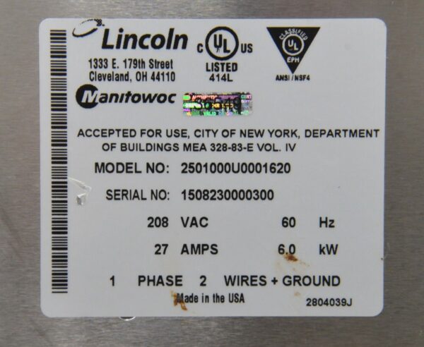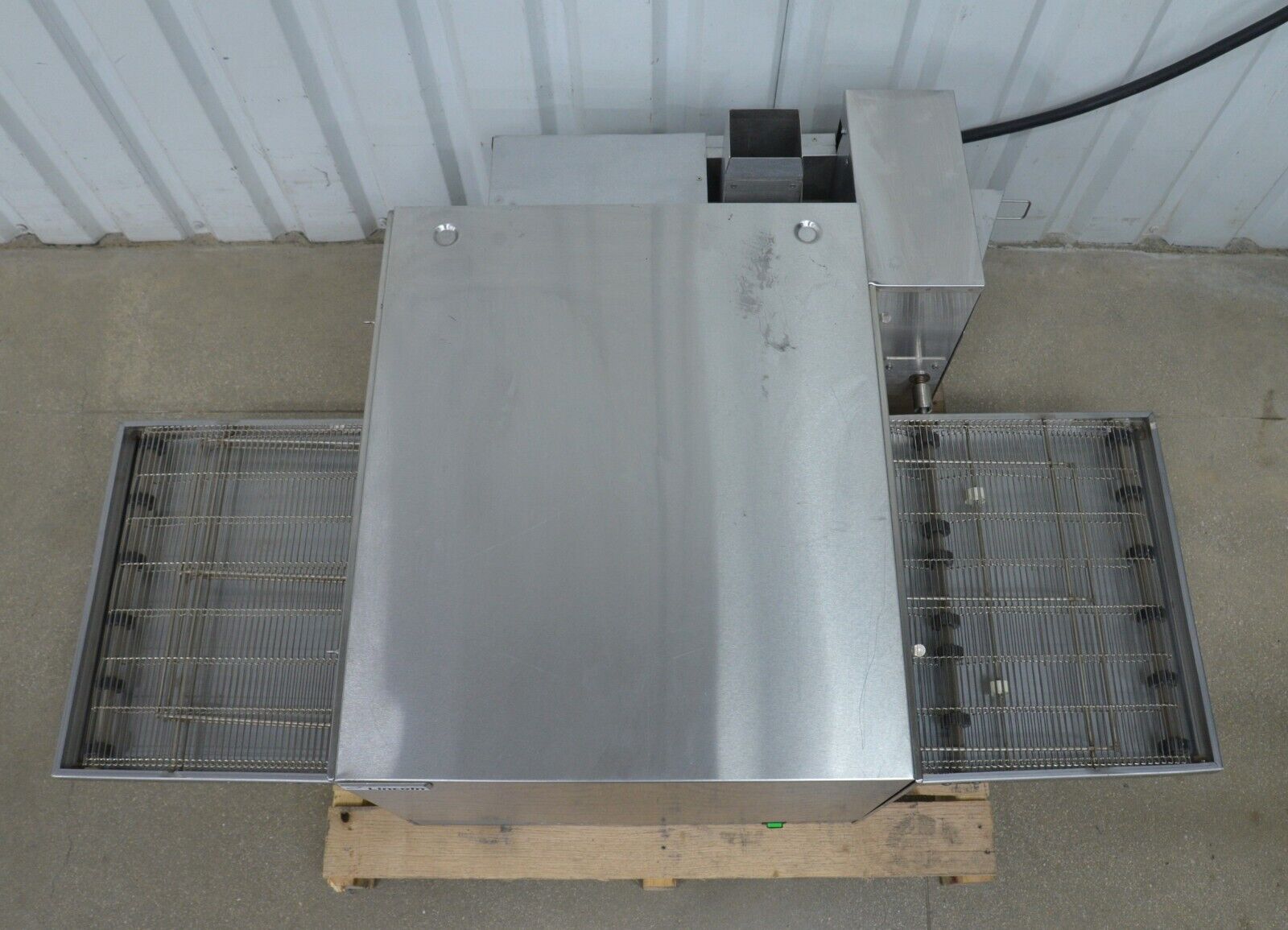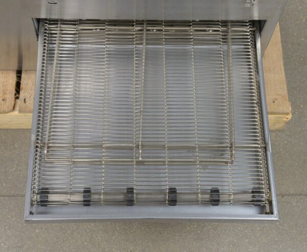 This Lincoln 48″ Electric 2500 Digital Countertop Impinger Conveyor Oven 208V 1PH is in good working condition. This unit powers on and heats up properly. The display screen responds properly to selection. The conveyor belt has a width of 16″ and rolls smoothly. This unit has a 20″ baking chamber. The connection points are clean and in good condition. There are a few scuff marks from previous use (see photos). This unit comes with a 30 day satisfaction guarantee. Includes everything in the pictures and nothing else.