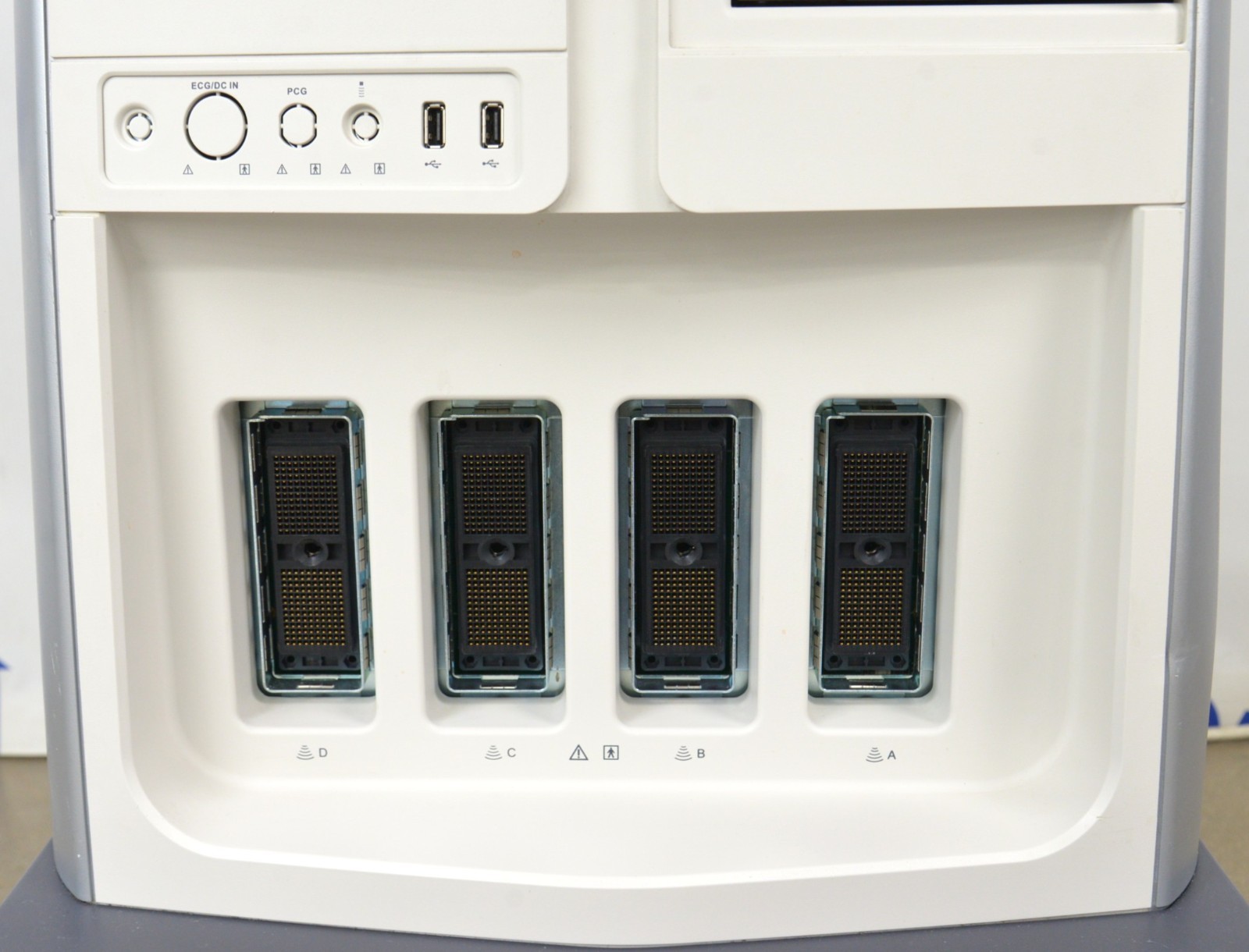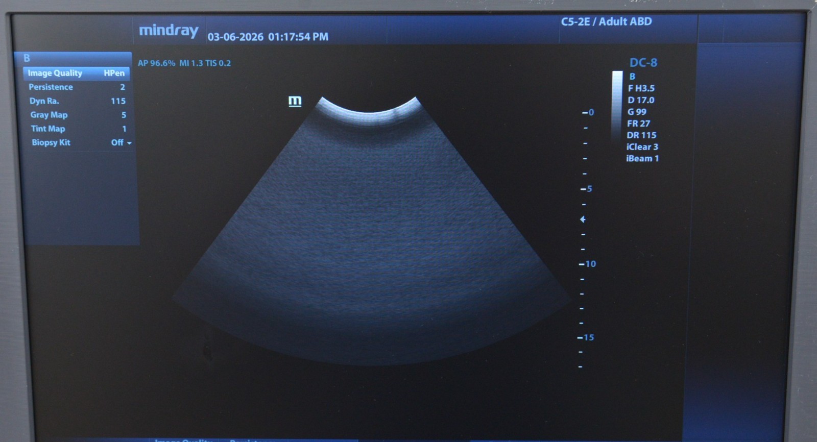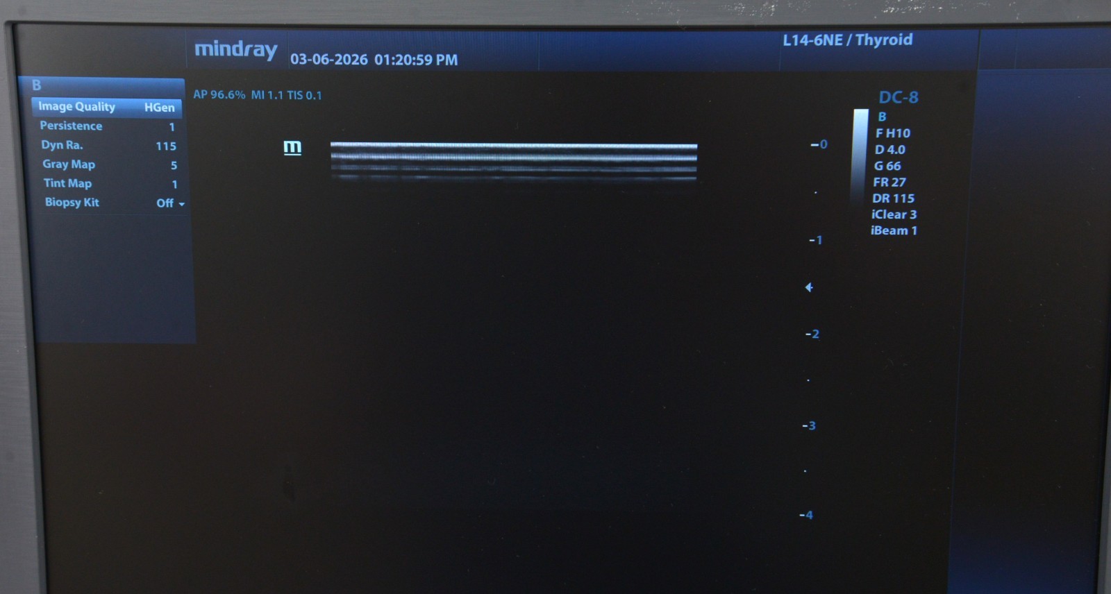 This Mindray DC-8 Diagnostic Ultrasound System 2013 W/ Mindray L14-6NE, L7-3E, & C5-2E Transducers is in great working condition. The unit powers on properly. Both display screens produce a clear image and respond to selection. The connections are clean and in good condition. The manual adjustments move properly. There are minor scuff marks and a few cracks in the plastic from previous use (see photos). The transducers appear to have drop out. This unit comes with a 30 day money back guarantee. Includes everything in the pictures and nothing else.