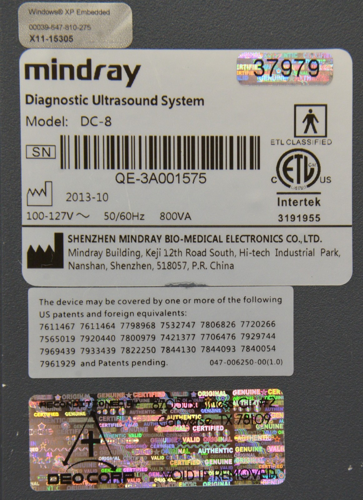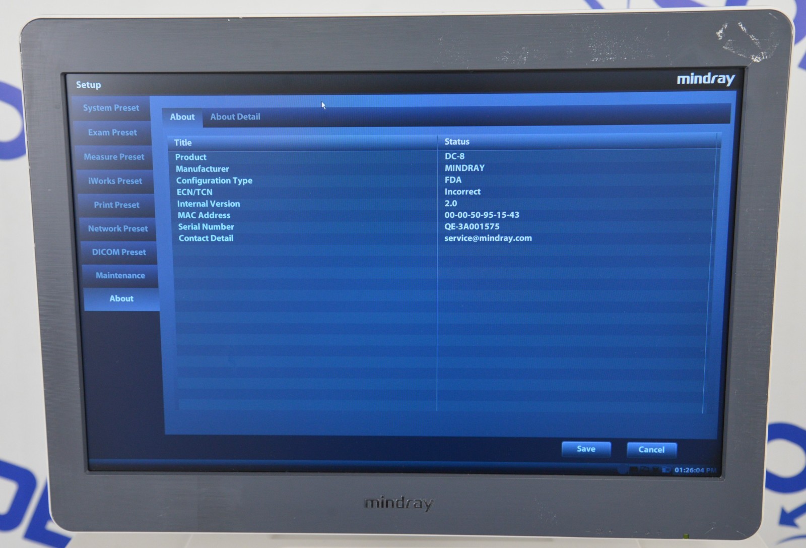 Mindray DC-8 Diagnostic Ultrasound System 2013 W/ Mindray L14-6NE, L7-3E, & C5-2E Transducers
