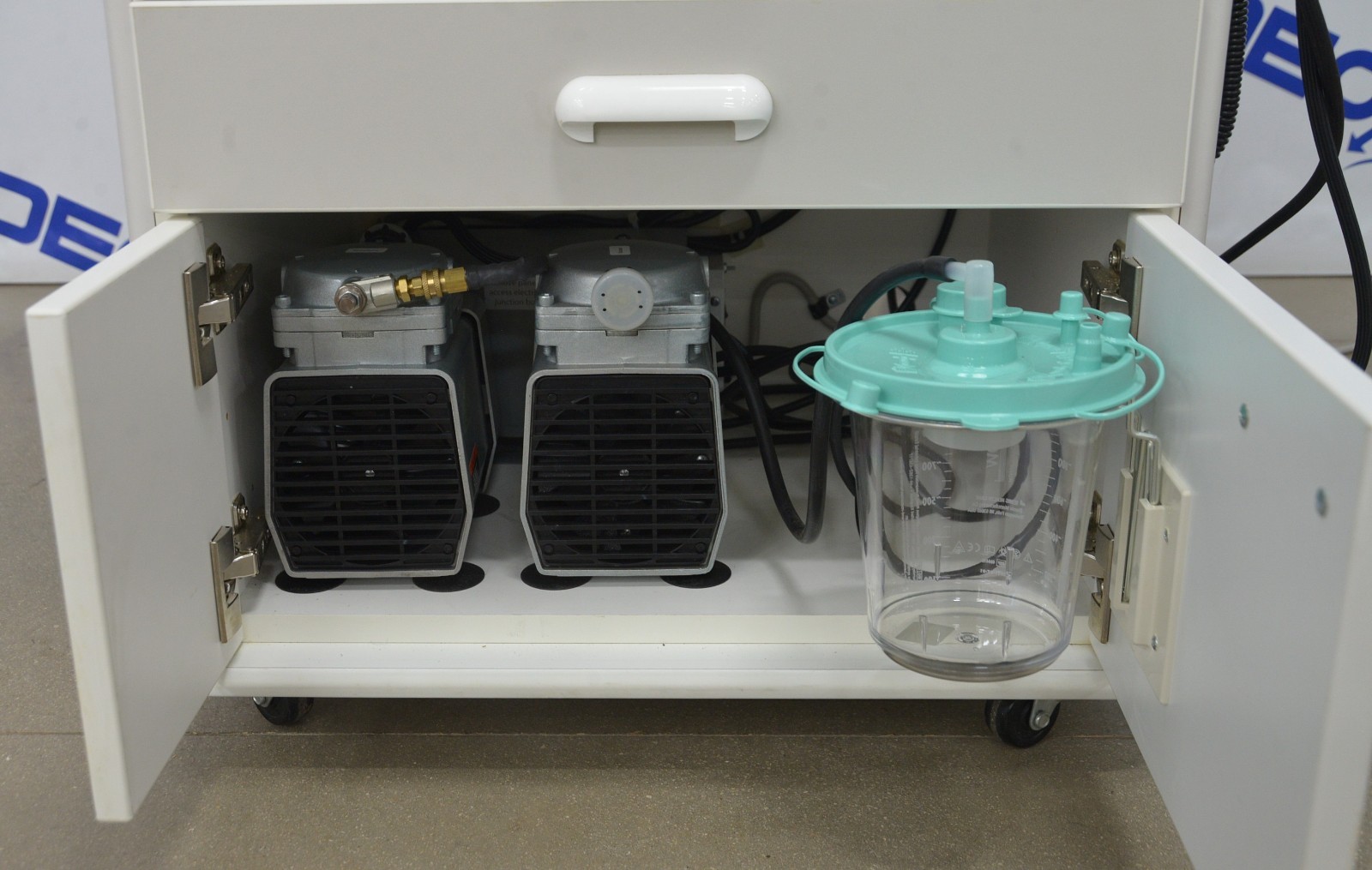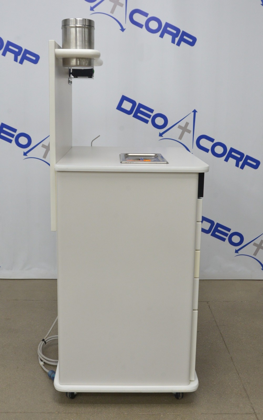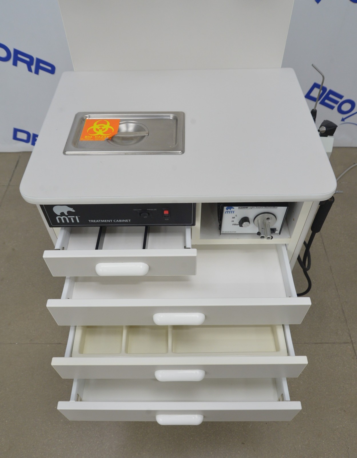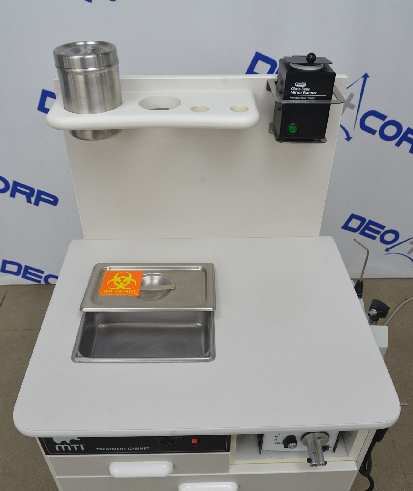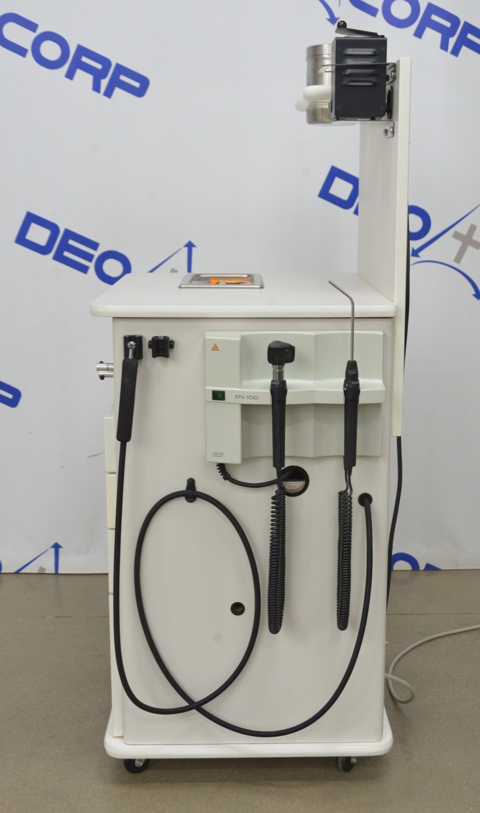 This MTI TC100A ENT Treatment Cabinet w/ H200W 2050 Light Source And HEINE EN 100 is in good working condition. This system powers on and all functions respond to selection. The HEINE EN 100 diagnostic system lighting adjustment responds properly. The glass bead mirror warmer heats up properly. The H200W 2050 Light Source lights up through each selection properly. Both vacuum and pressure generators respond and function properly. There are some minor scuff marks from previous use (see photos). This unit comes with a 30 day satisfaction guarantee. Includes everything in the pictures and nothing else.