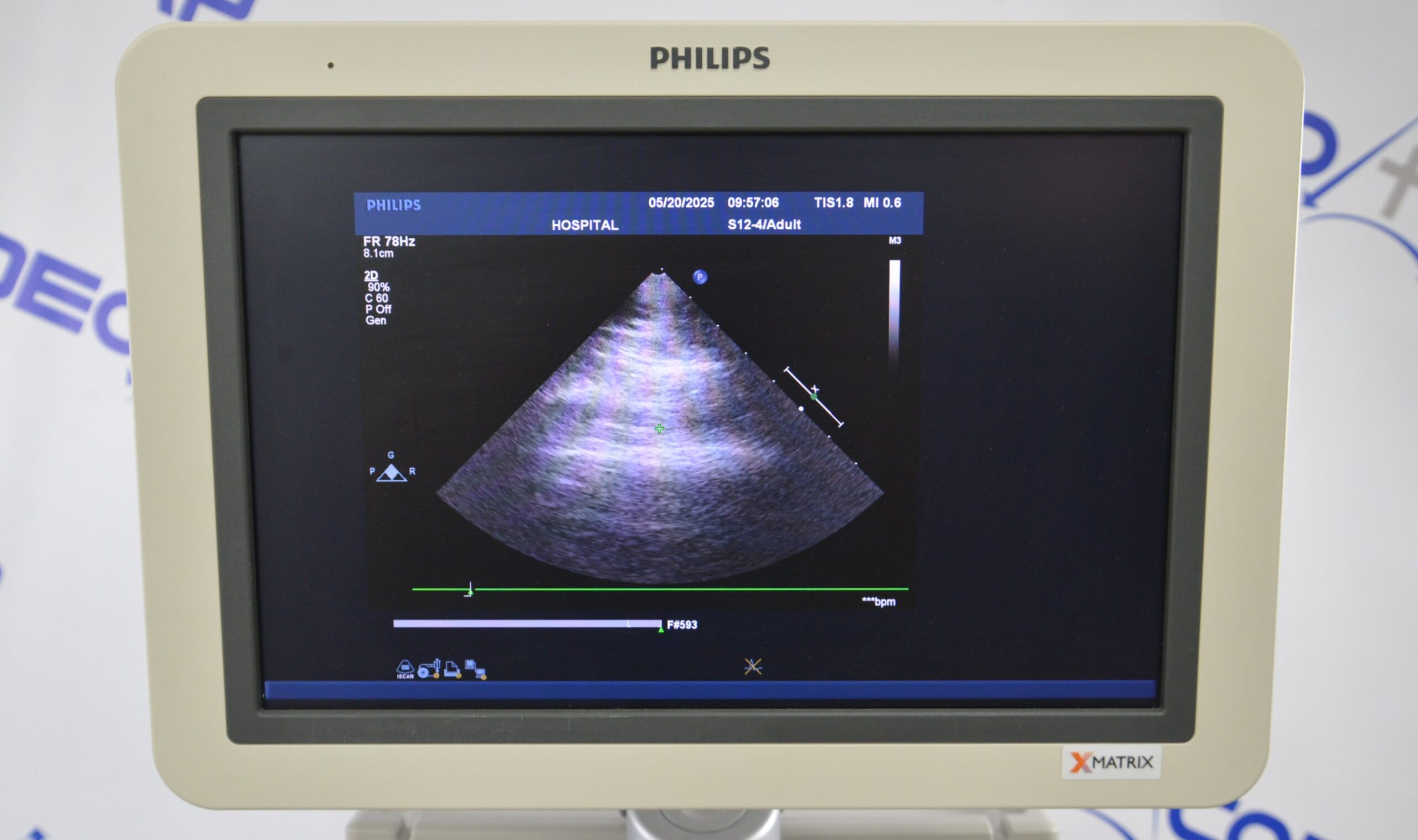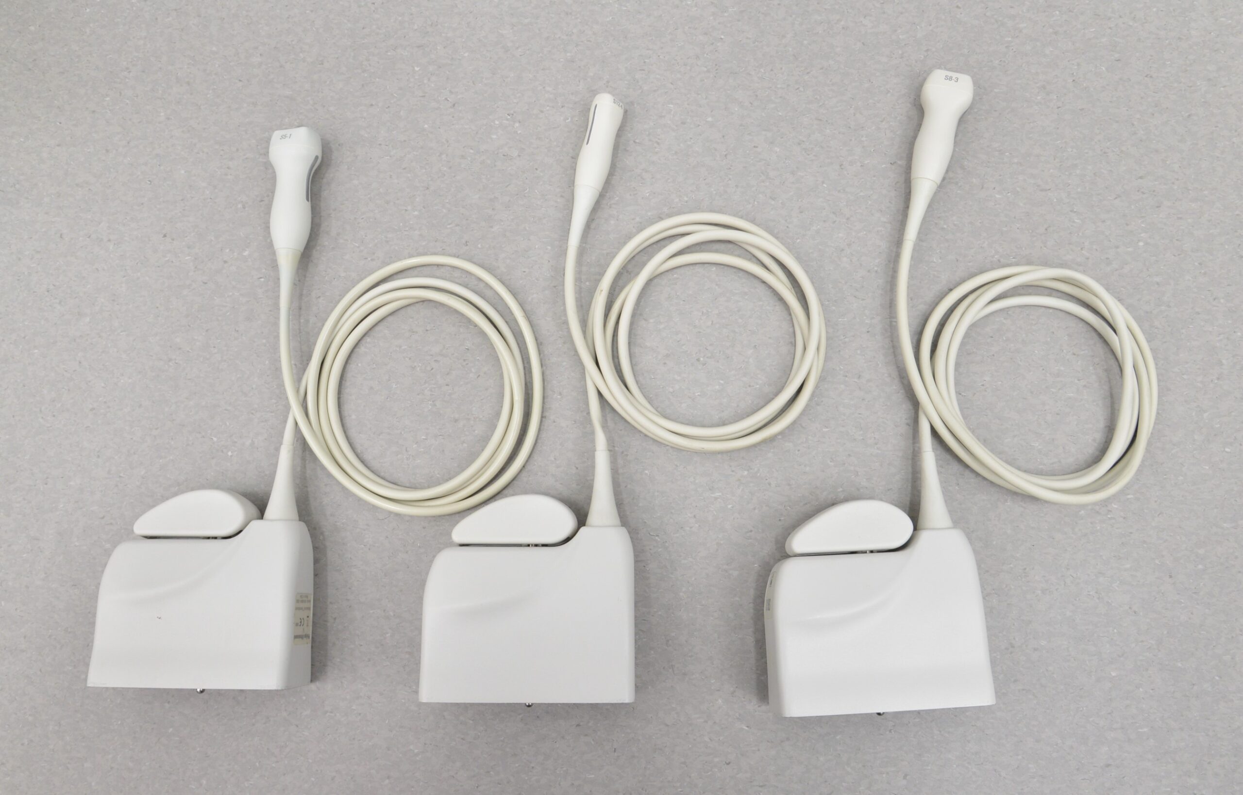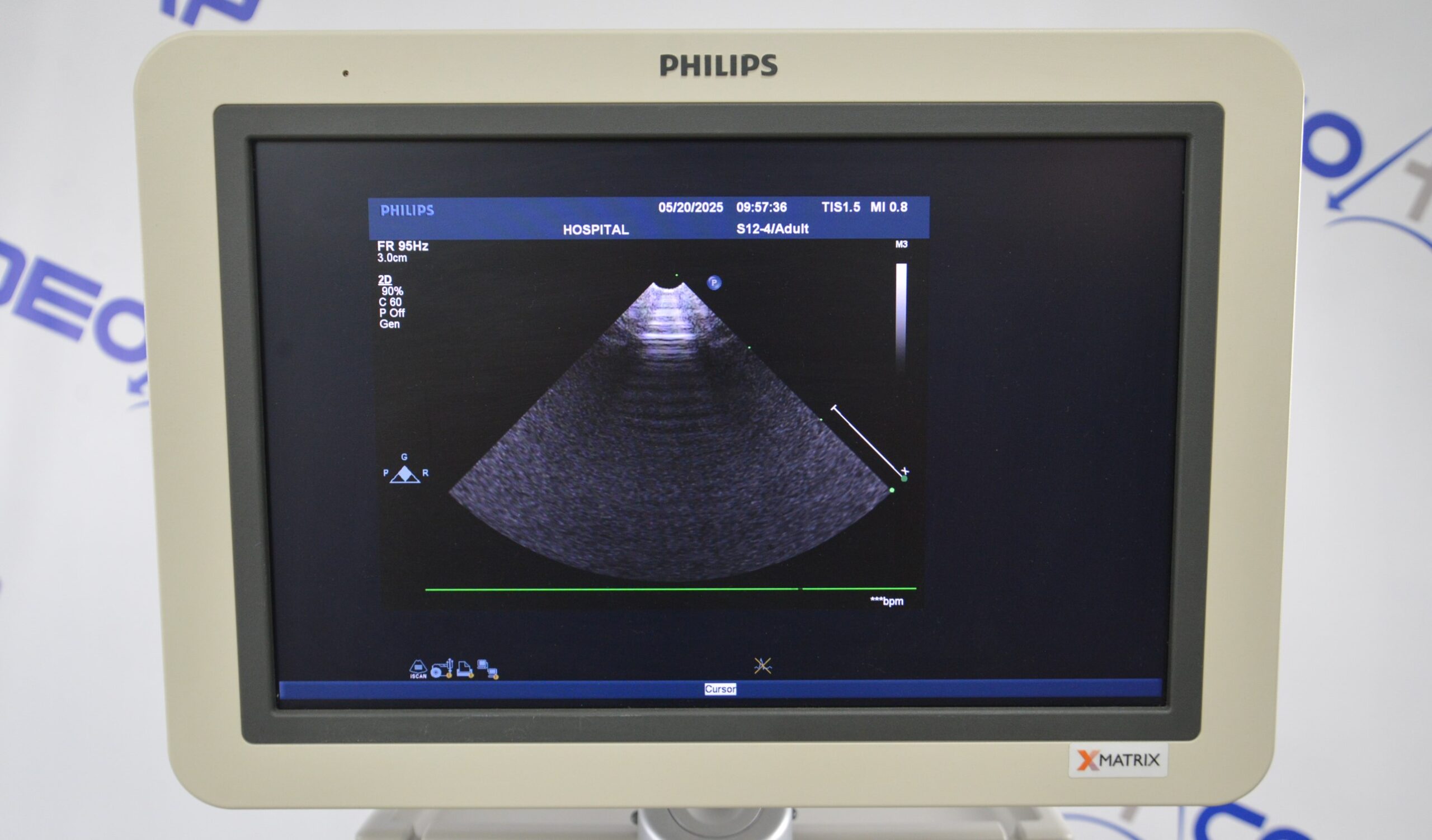 This Philips iE33 Ultrasound System 8500-0082-01 W/ W/ S5-1, S8-3 & S12-4 Transducers is in good working condition. The unit powers on properly. The screens produce a clear image. All buttons and knobs respond to selections. The transducers appear to have dropout. There are some scuff marks and cracks from previous use (see photos). This unit comes with a 30 satisfaction guarantee. Includes everything in the pictures and nothing else.