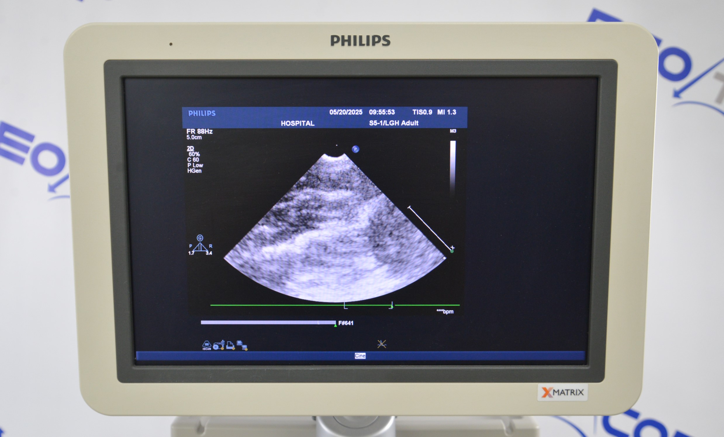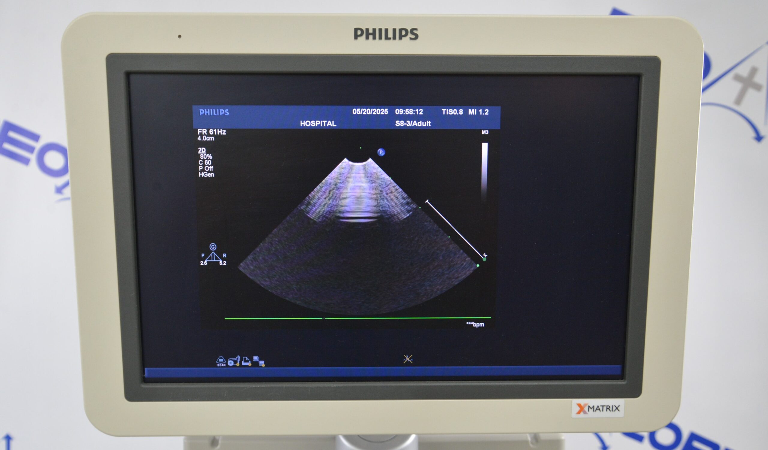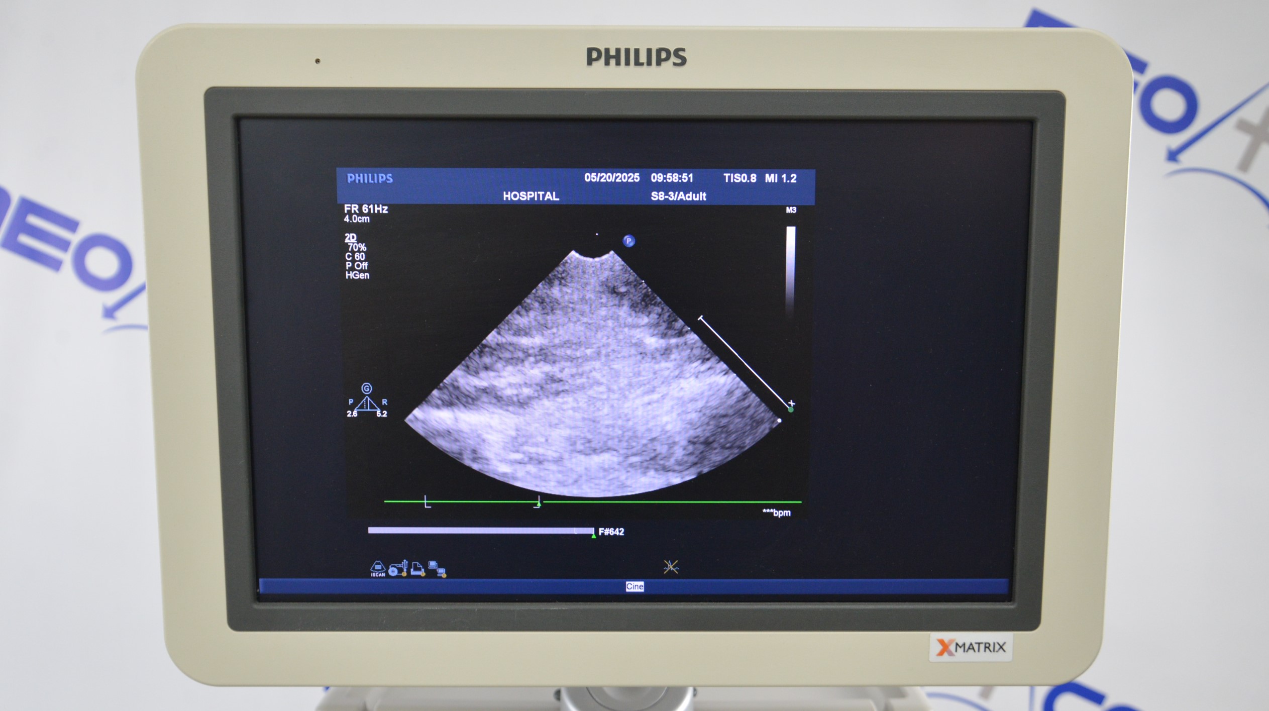 This Philips iE33 Ultrasound System 8500-0082-01 W/ W/ S5-1, S8-3 & S12-4 Transducers is in good working condition. The unit powers on properly. The screens produce a clear image. All buttons and knobs respond to selections. The transducers appear to have dropout. There are some scuff marks and cracks from previous use (see photos). This unit comes with a 30 satisfaction guarantee. Includes everything in the pictures and nothing else.