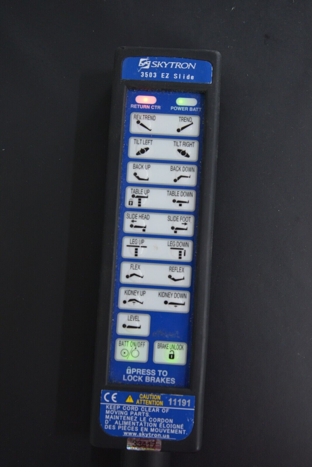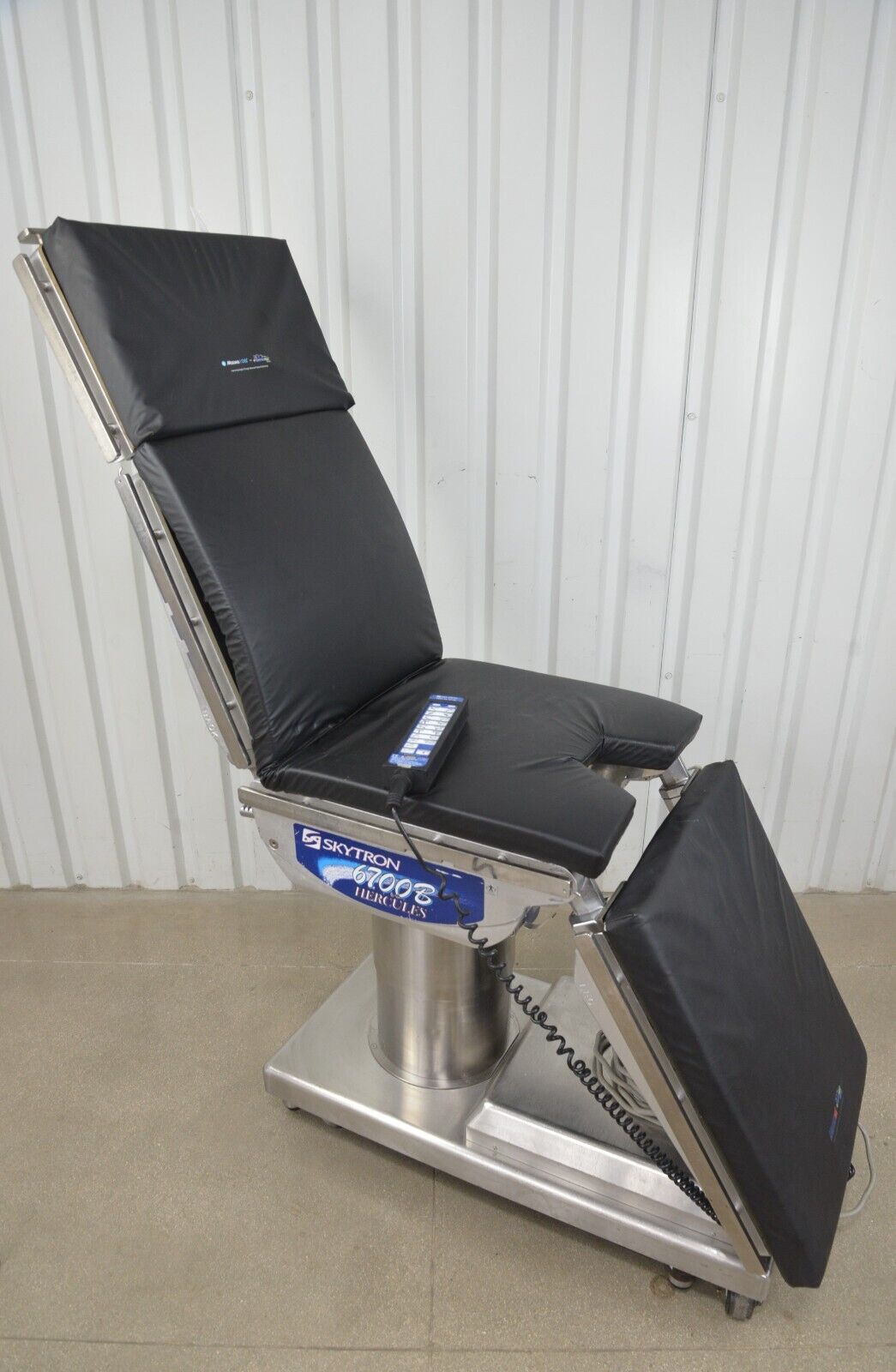 This Stryker Skytron 6700B Hurcules Surgical Table W/ Skytron 3503 E2 Remote 11191 is in good working condition. The table powers on and functions properly and smoothly through all range of motion. All manual and hydraulic components are in good working condition. The table responds to the remote and backup controls properly. All padding is in good condition. The overall cosmetic condition of this unit is good with the exception of some minor scuff marks associated with previous use (see photos). This unit is missing the foot section. The table easily comes apart into 4 pieces. This unit comes with a 30 day money back guarantee. Includes everything in the pictures and nothing else.