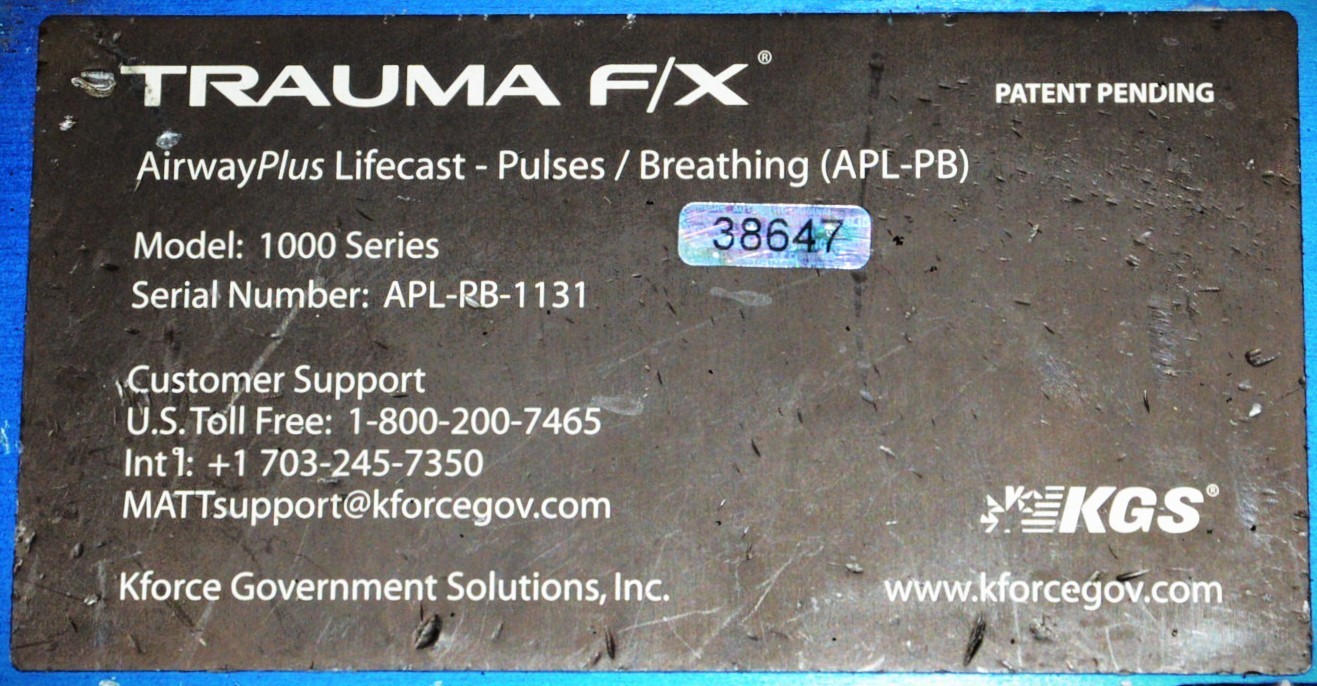 This Tacmed Solutions Trauma F/X APL-PB AirwayPlus Lifecast Pulses/Breathing 1000 Series Trauma Simulator came from a working environment and is in good condition. The airway and compartments are clear and in good condition. The skin has no tears. It is stained and discolored (see photos). The wheels on the case are missing and one of the hinges is damaged. This unit comes with a 30 day satisfaction guarantee. Includes everything in the pictures and nothing else.
