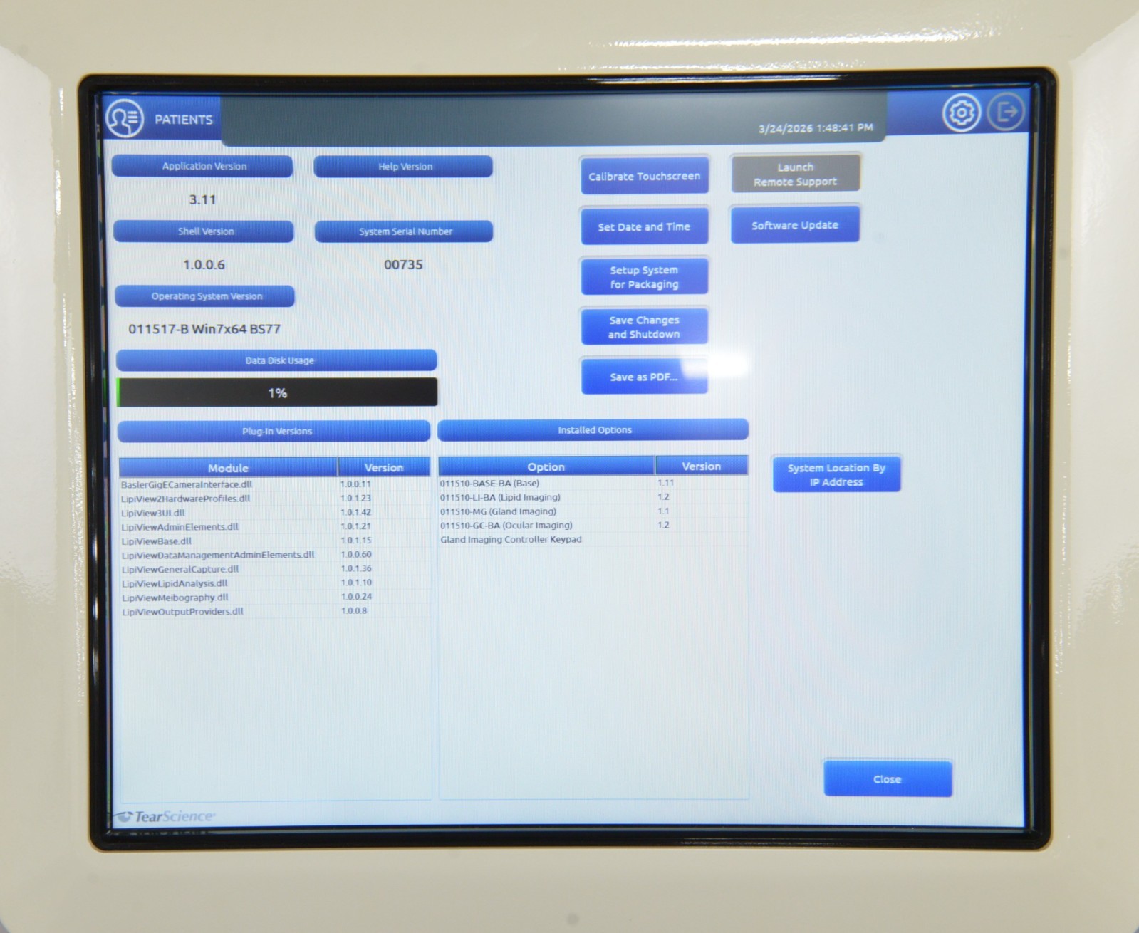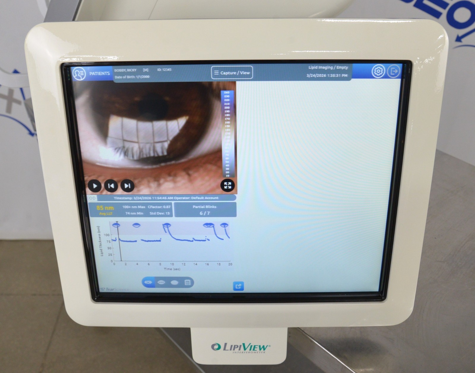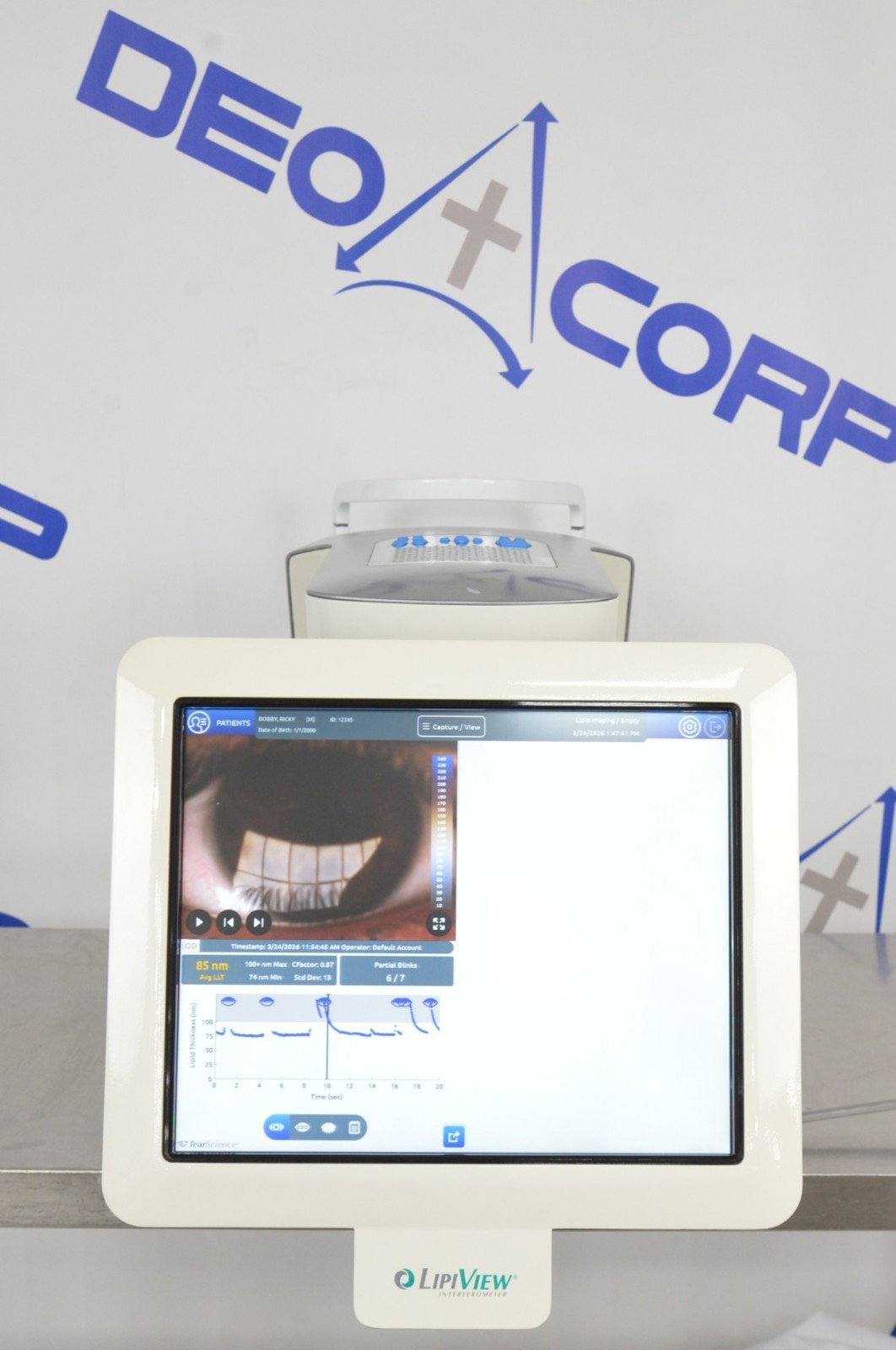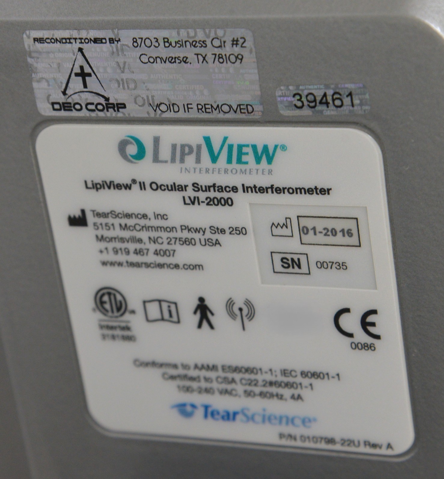 This Tear Science LipiView II LVI-2000 Ocular Surface Interferometer is in great working condition. The unit powers on and the touch screen and buttons respond properly to selection. The lens has a clear view with no visible obstructions. This device is intended to capture, archive, manipulate, and store digital images of specular observations of the tear film, meibomian glands under near-infrared illumination, and the ocular surface and eyelids under white illumination. All the adjustments moves smoothly. There are scuff marks from previous use (see photos). This unit comes with a 30 day satisfaction guarantee. Includes everything in the pictures and nothing else.