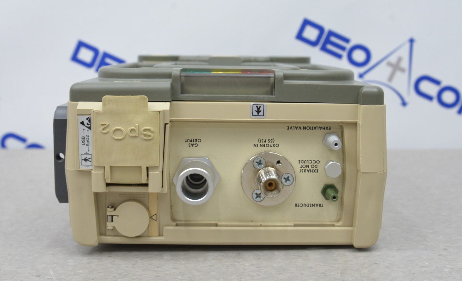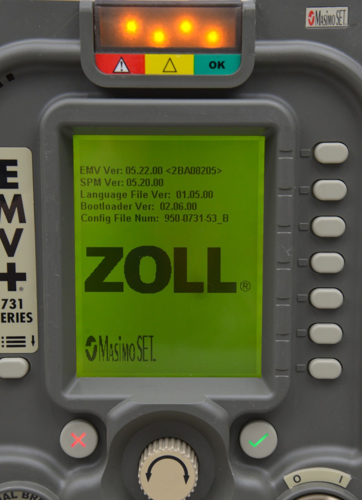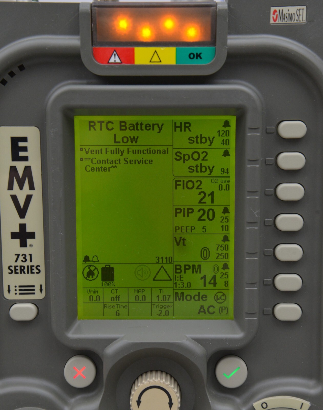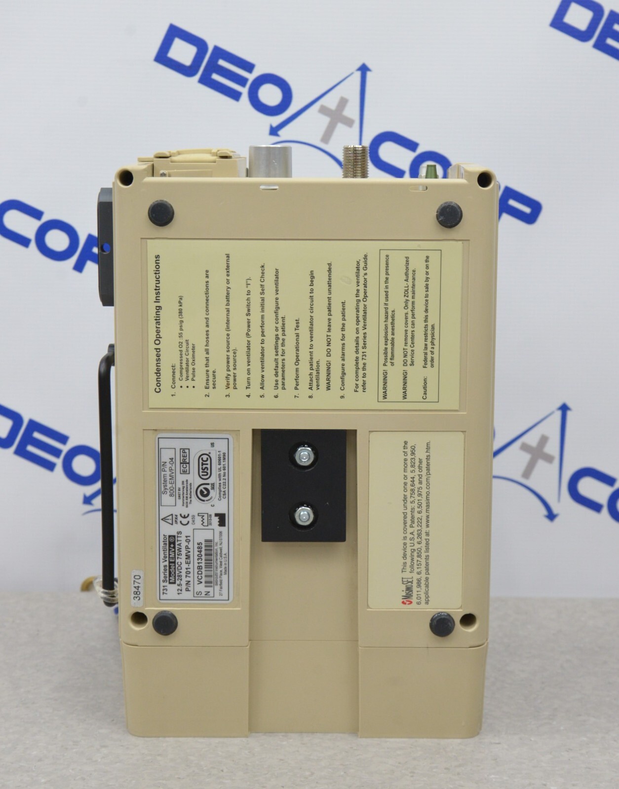 This Zoll Uni-Vent EMV+ 731 Series Ventilator W/ Masimo SpO2 is in good working condition. The the unit powers on and the buttons and knobs respond properly to selections. Connection points are clean and in good condition. The battery holds a charge. This unit does not include the power supply. This unit is due for a PM (see photos). There are minor scuff marks and the battery cover is missing. This unit comes with a 30 day satisfaction guarantee. Includes everything in the pictures and nothing else.